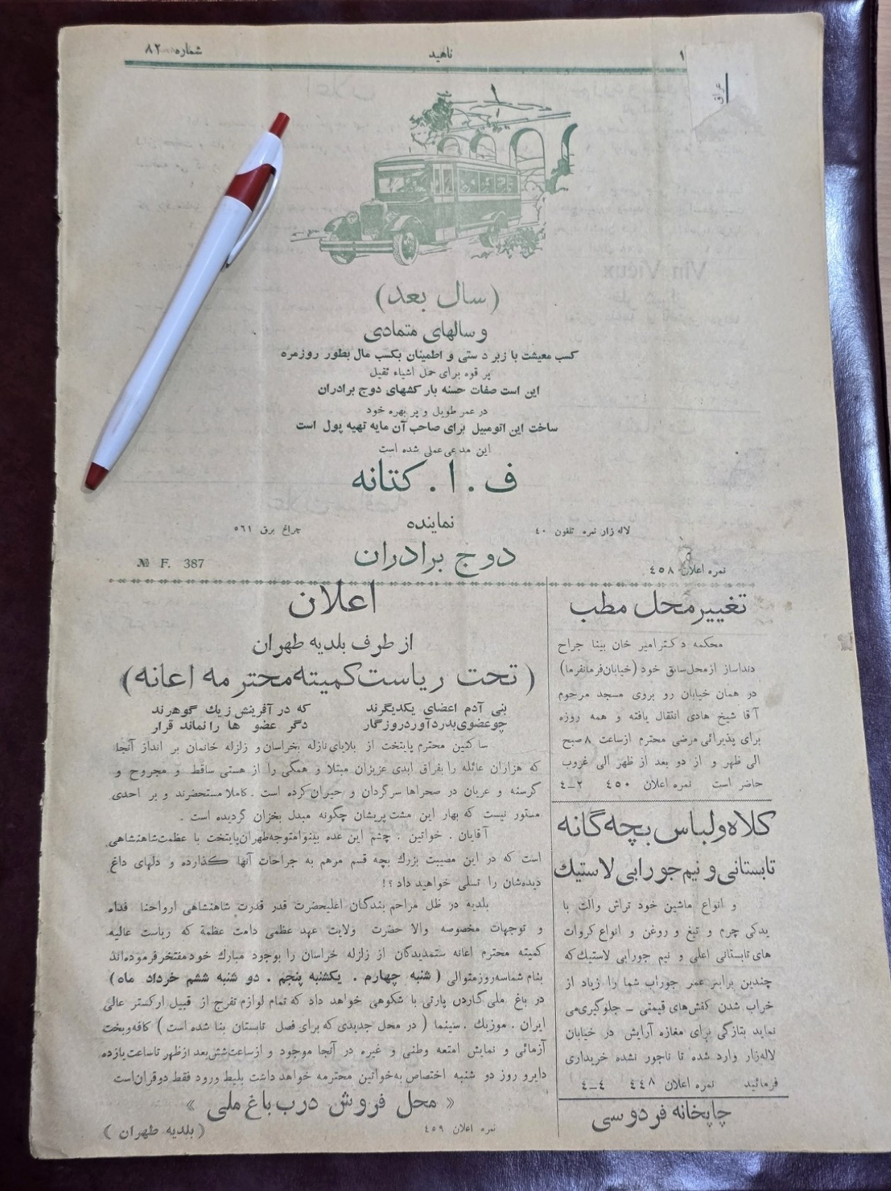 دارای مطالب مهم و اعلان های جالب و مهم از جمله اعلان اتومبیل بارکش فورد که از اولین اتومبیل های آن زمان بودند و اعلانهای متنوع دیگر
