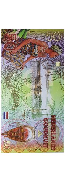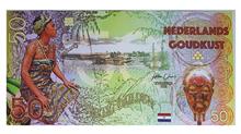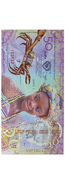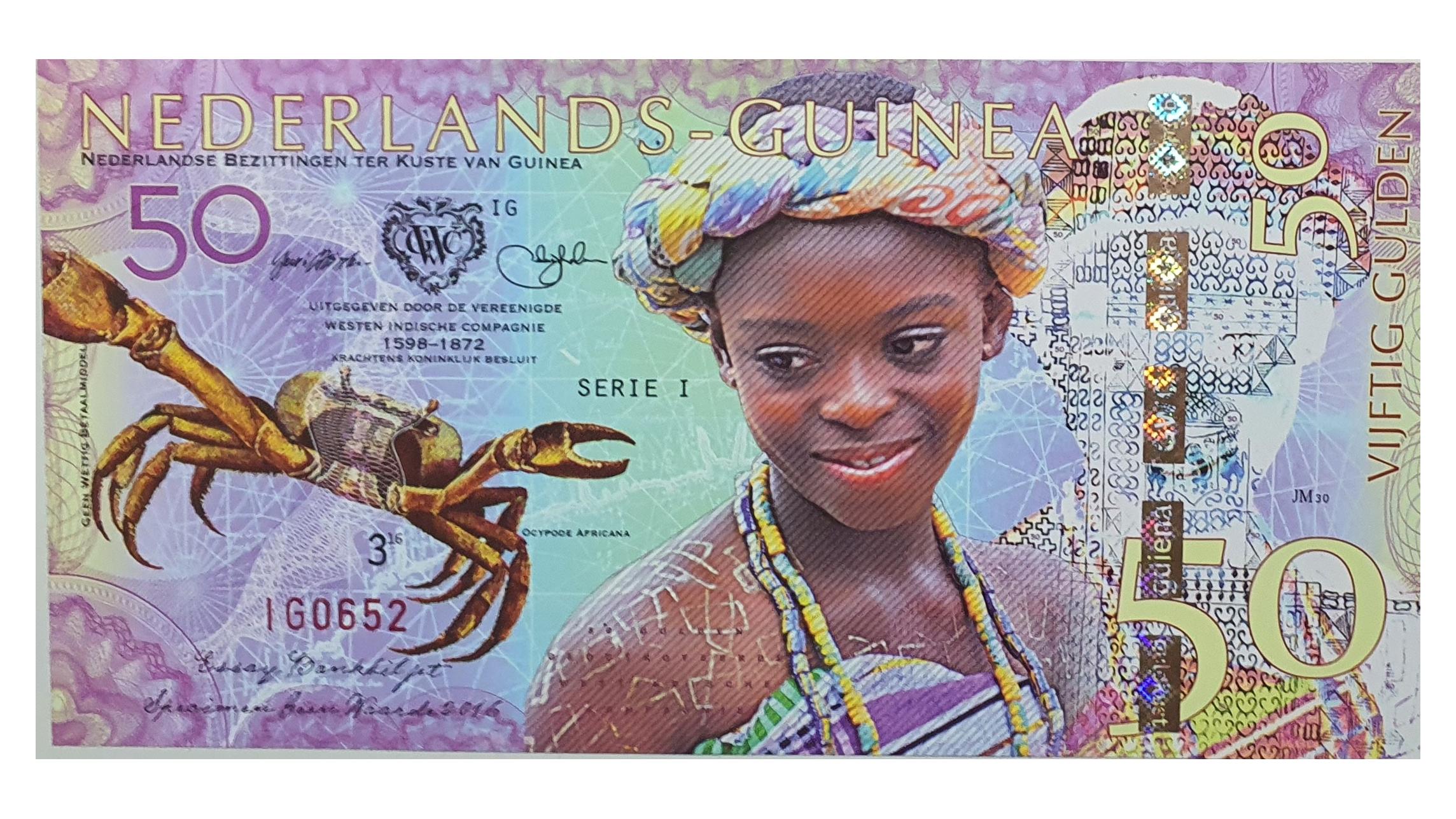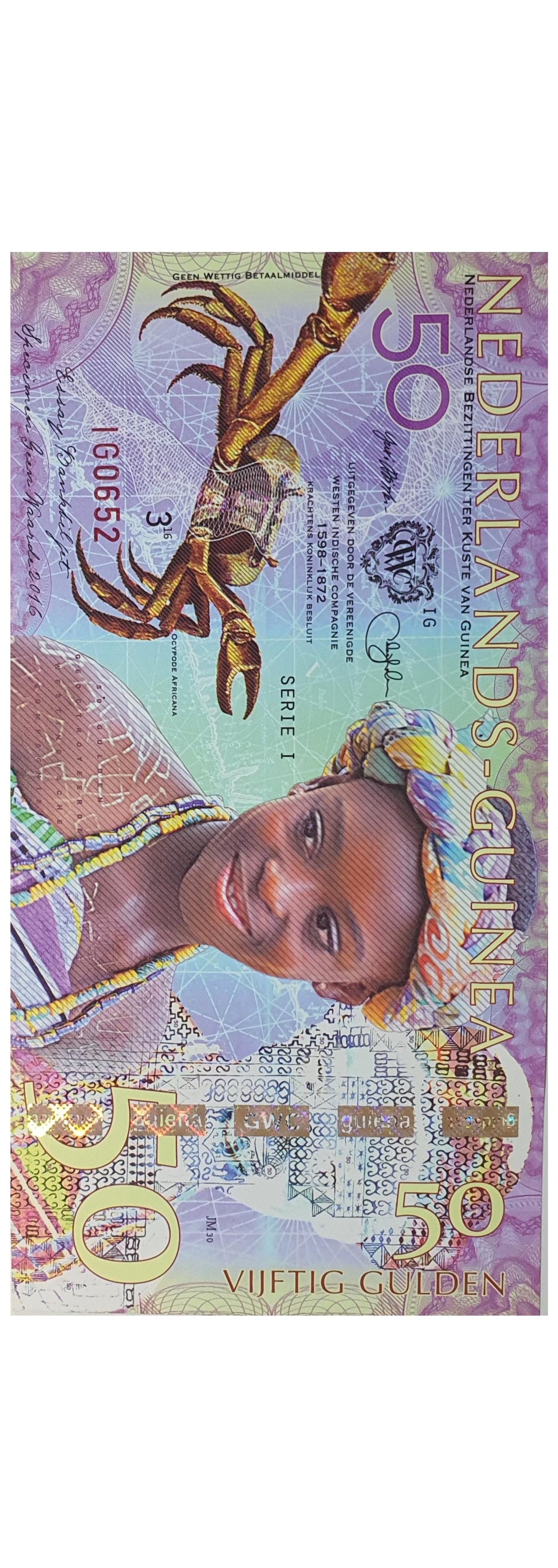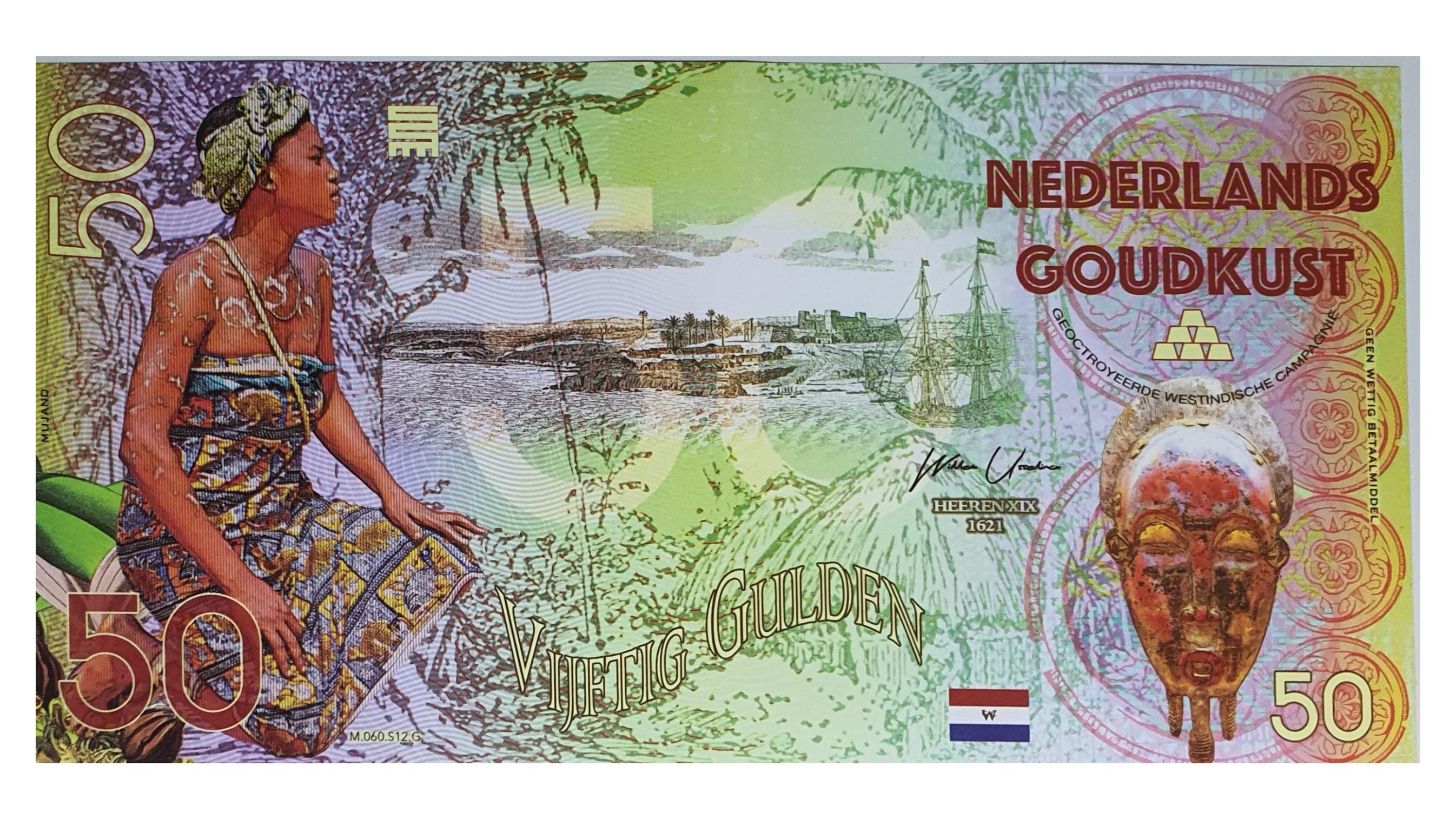 کیفیت اسکناس نایاب پلیمر از مجموعه اسکناس های استعماری در ابعاد 83 × 165 میلی متر با الهام از دوران استعمار هلند بر گینه یا ساحل طلا (غنای فعلی) مزین به تصویر زن بومی آفریقایی ، نماد حیات وحش منطقه ، عناصر هولوگرام و چاپ پیشرفته ، رقص آئینی زنان آفریقایی ، ماسک سنتی ، پرچم هلند ، دارای شماره سریال اختصاصی در سال 2016 میلادی چاپ شده است و هدیه ای جذاب و تاریخی برای کلکسیونرها و مجموعه داران به حساب می آید و هر قطعه این اسکناس در بازار نوستالژی کلکسیون و سایت های آنلاین معتبر خارجی تا 45 دلار ارزش دارد