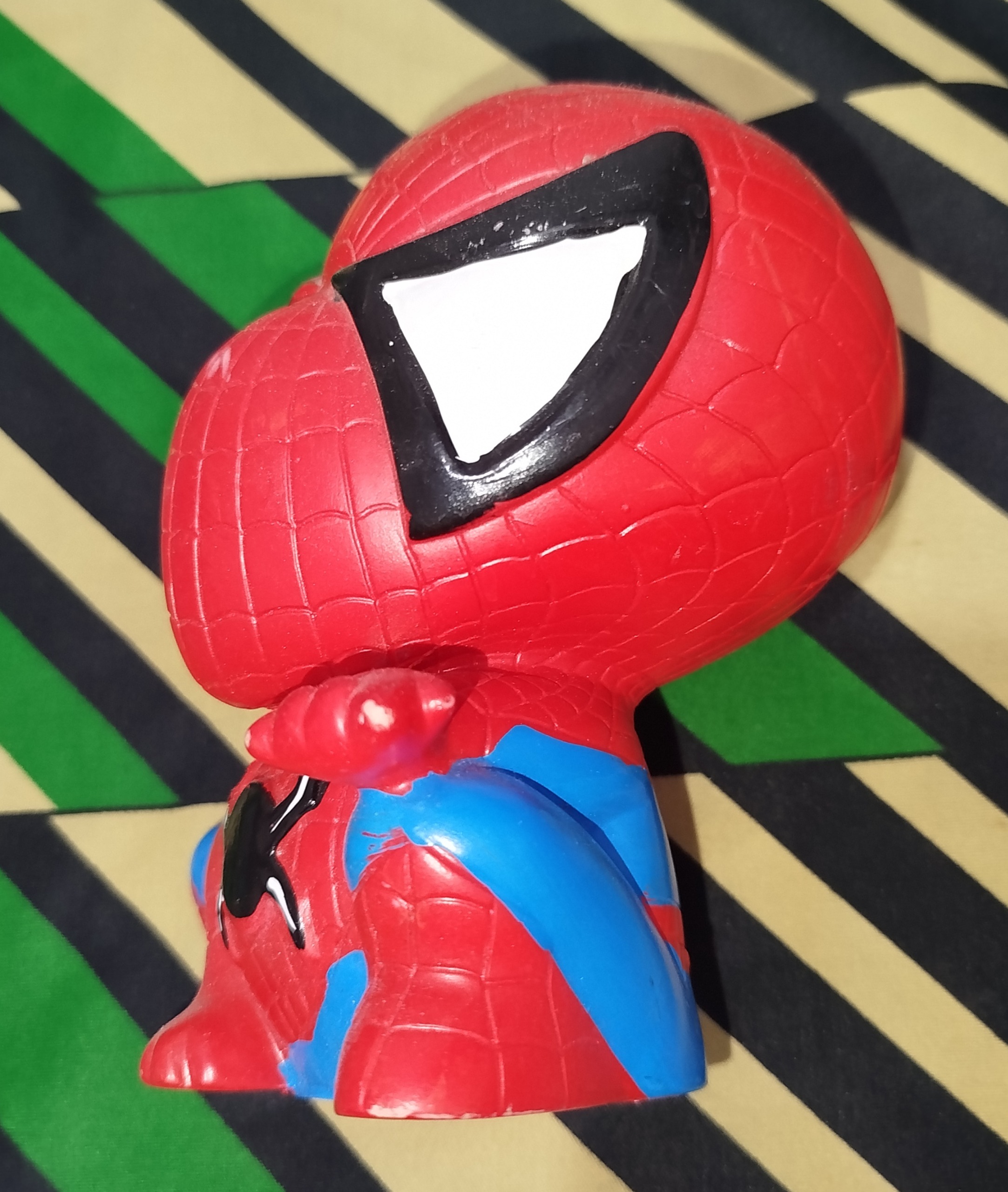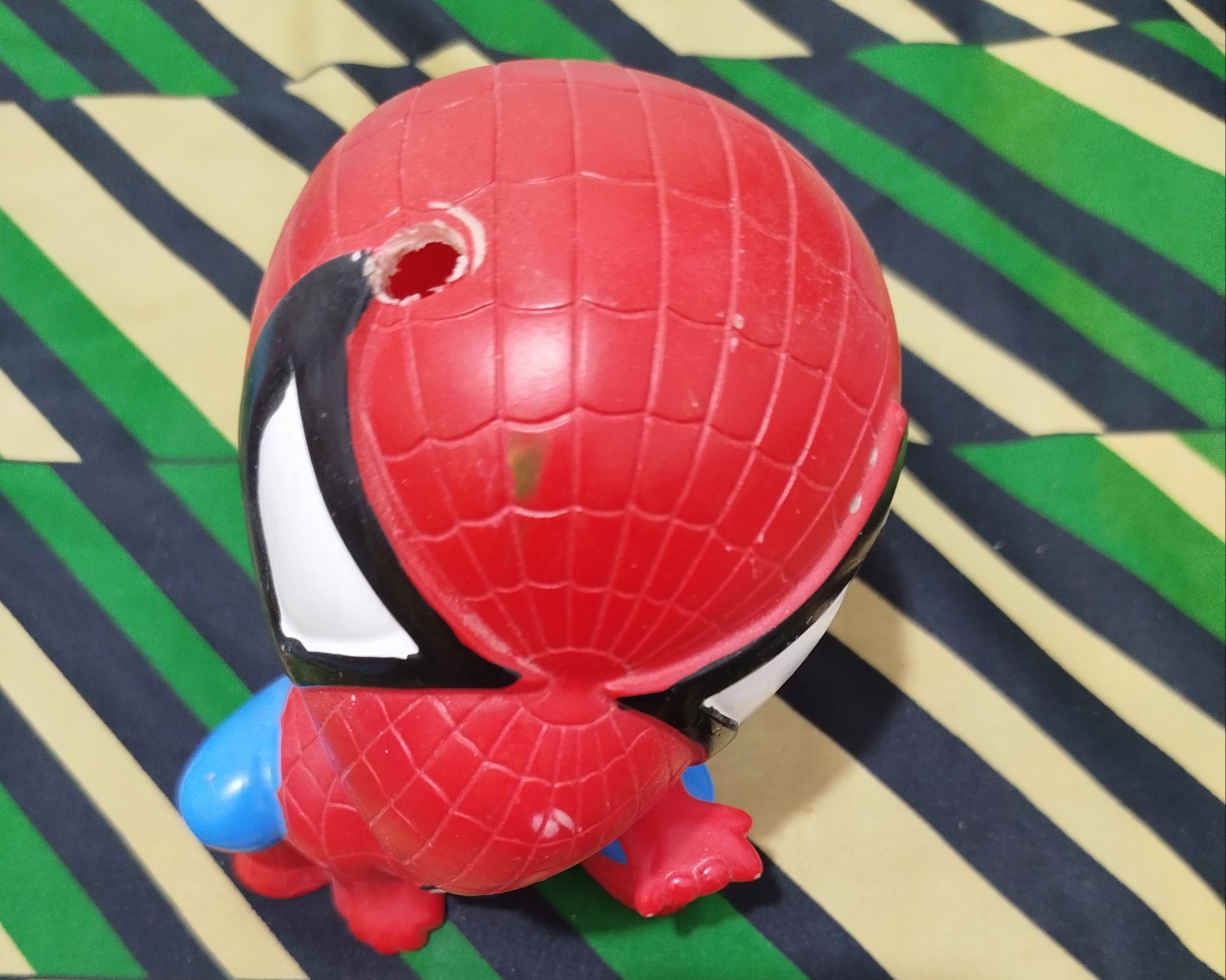 قلک پلاستیکی مرد عنکبوتی ، داخل سر قلک سوراخ شدگی دارد که تصویر گذاشته ام،زوم شده ببینید.