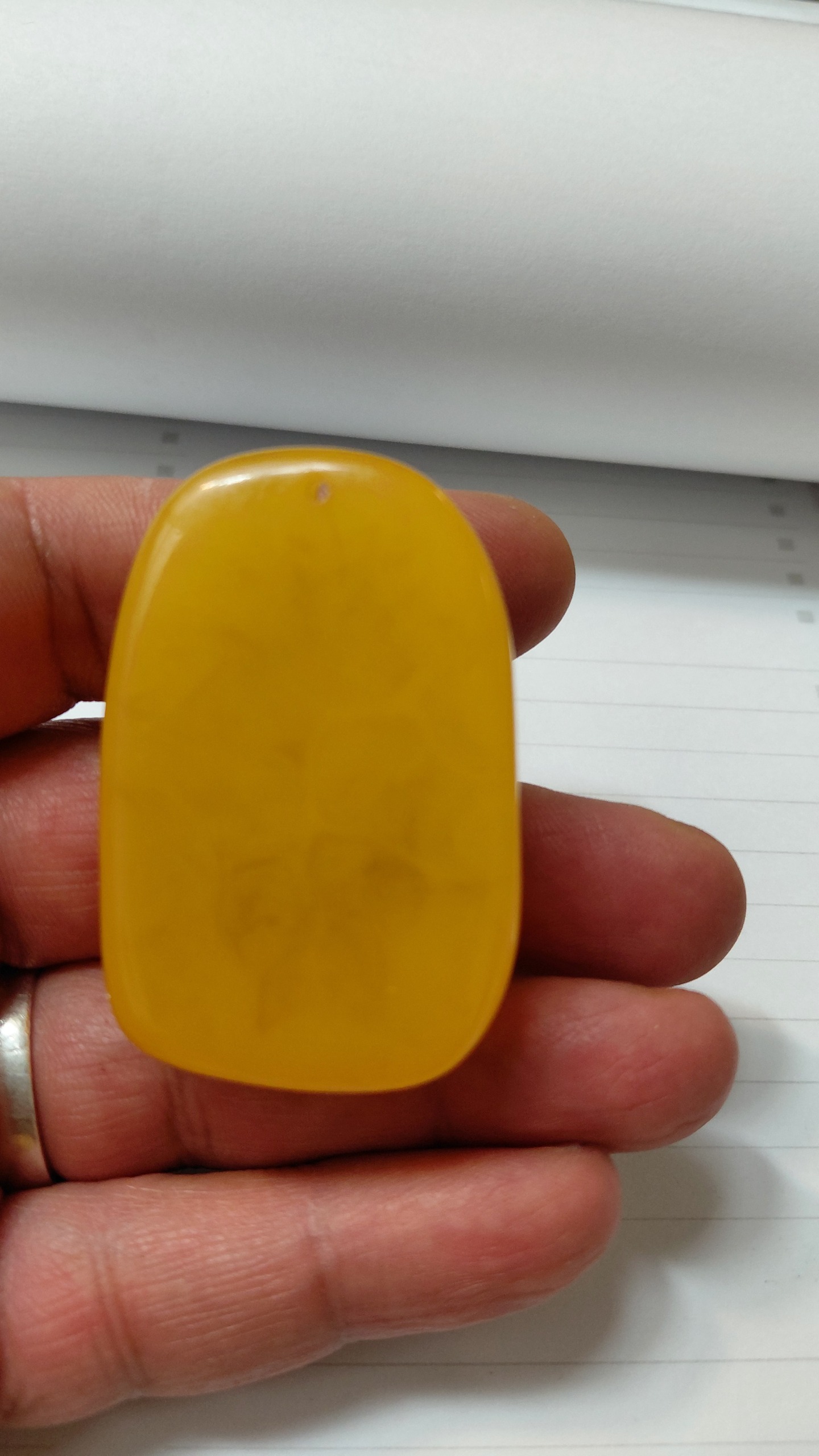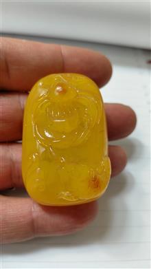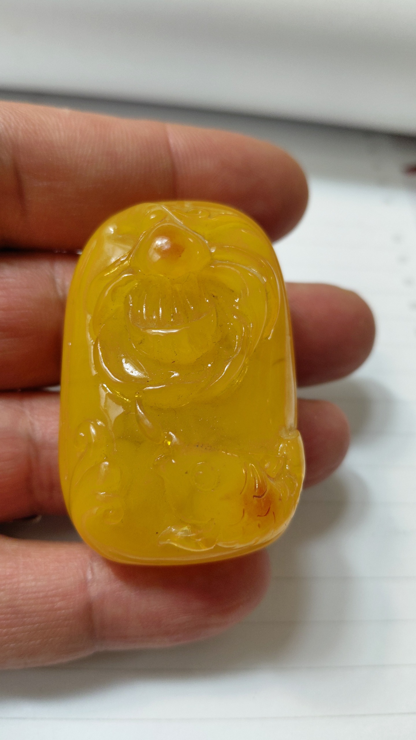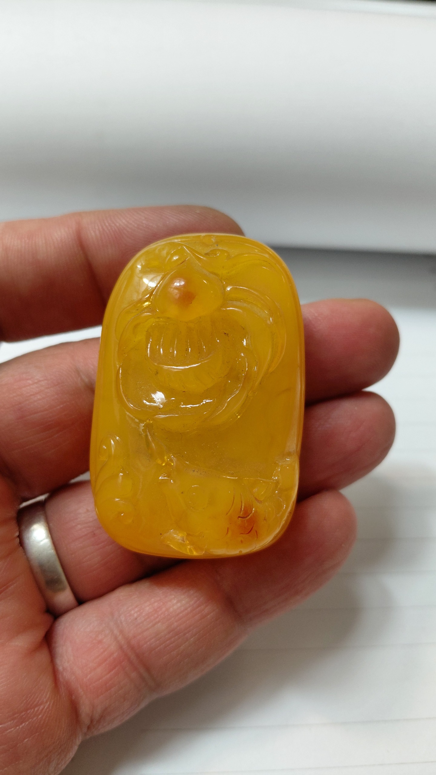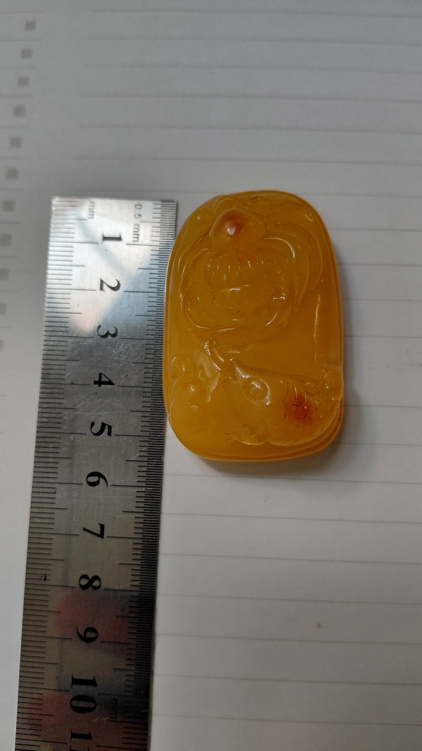 یک تیکه سنگ کهربا با نقش خرچنگ و ماهی کنده کاری شده روی کهربا مصنوعی.سایز کهربا داخل عکس کنار خط کش مشخص شده.