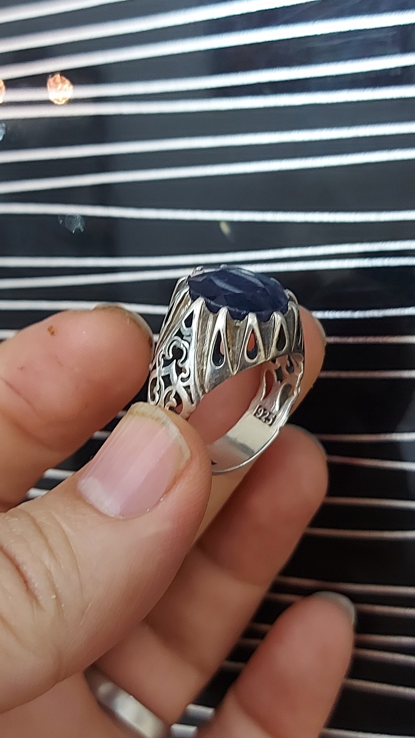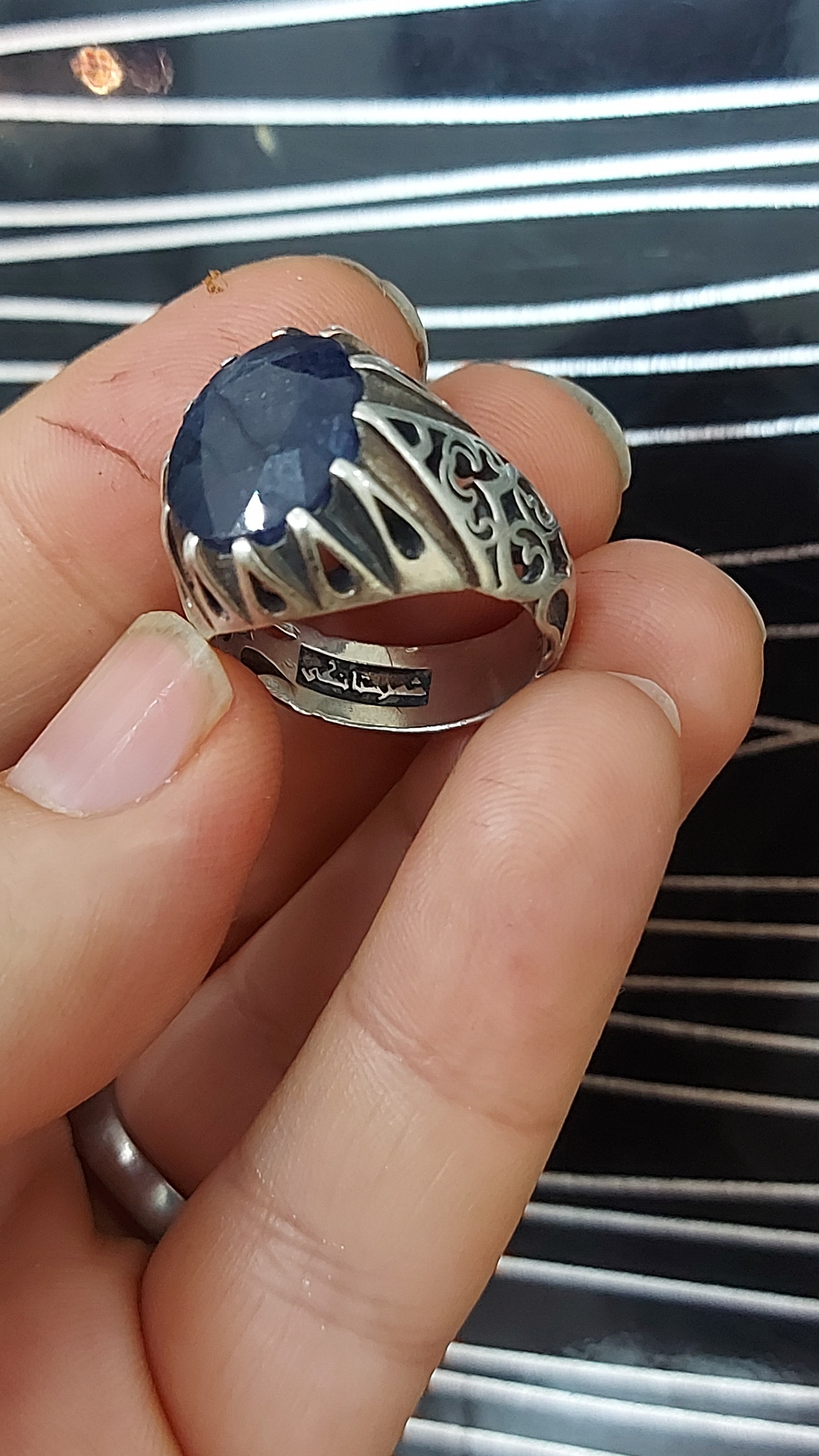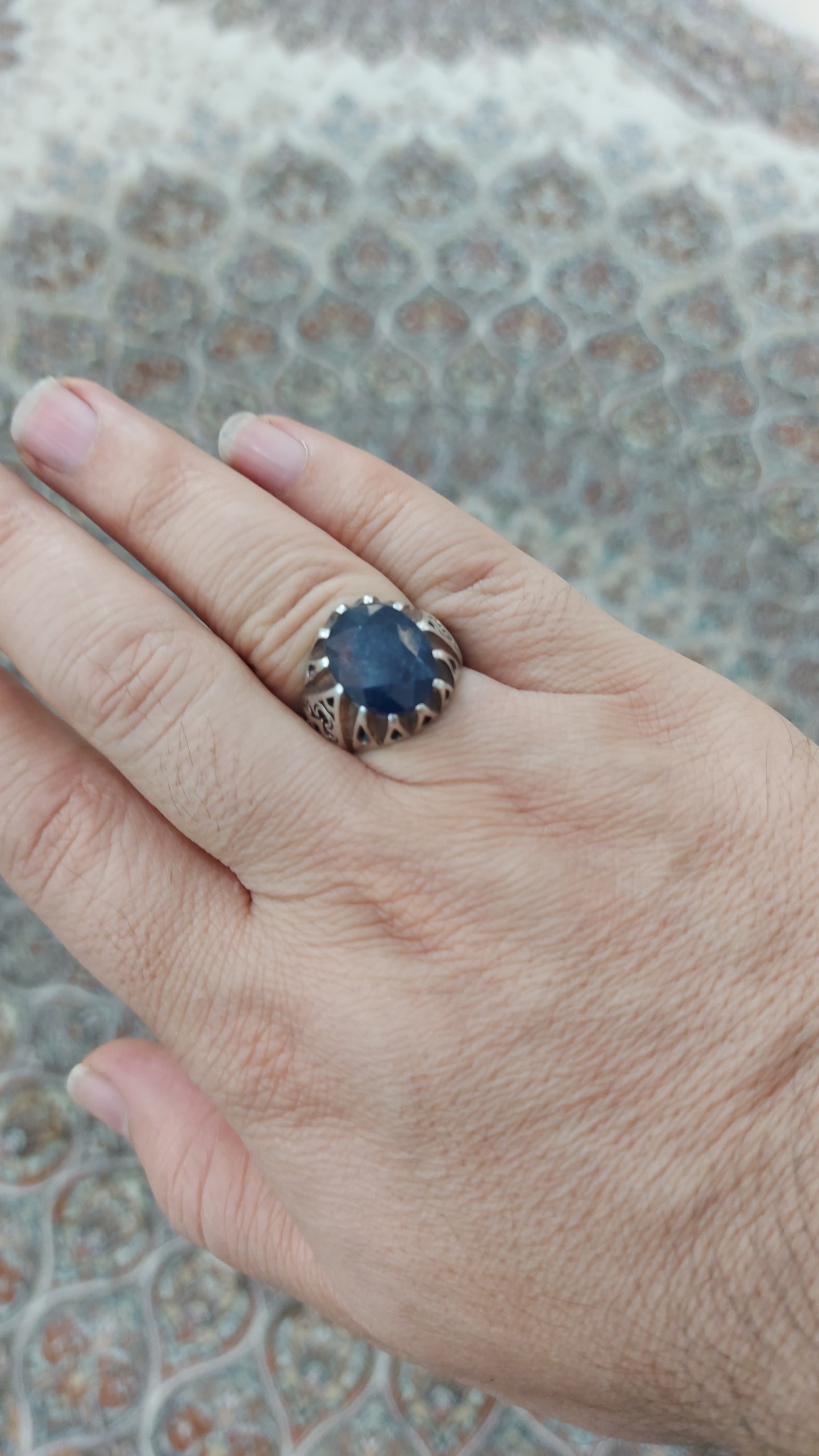 انگشتر نقره یاقوت کبود معدنی اصل تراش الماس درشت و تلألو نوربالا با رکاب کاملا دستساز وکیل و مهر دار سایز 63_64