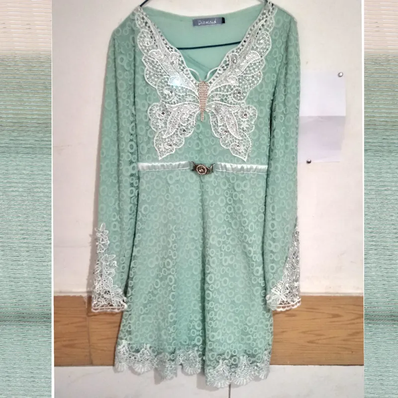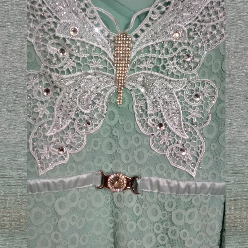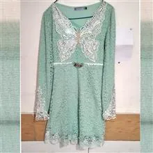 لباس مجلسی رنگ و طرح رو و پشت لباس مطابق تصاویر...آستر دار و گیپور بافی شده و نگین کاری شده ..لطفا تصاویر رو زوم کنید و با دقت مشاهده کنید...بسیار زیبا و خوش فرم و باکیفیت هست..مناسب سایز 46 هست ولی یکی دو سایز بزرگ و کوچکتر هم میشه پوشید .. ....نگین بزرگ زیبا روی سگک کمربندی و طرح گیپور پروانه با نگین های باکیفیت رو و پشت لباس