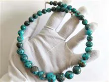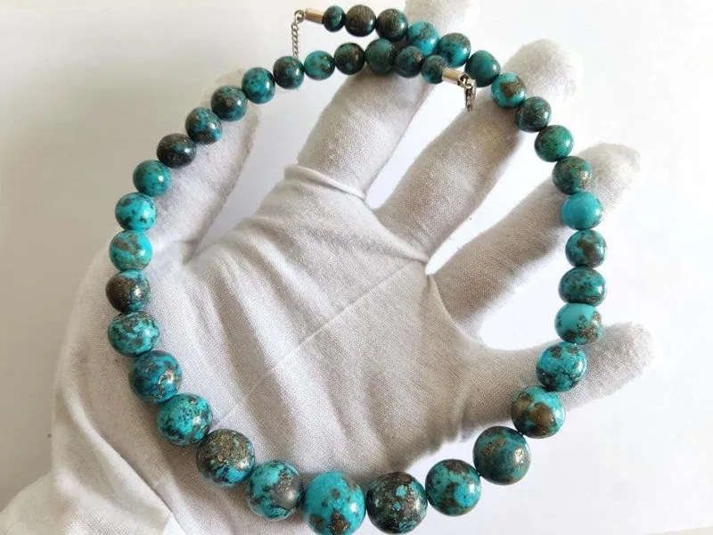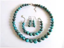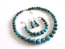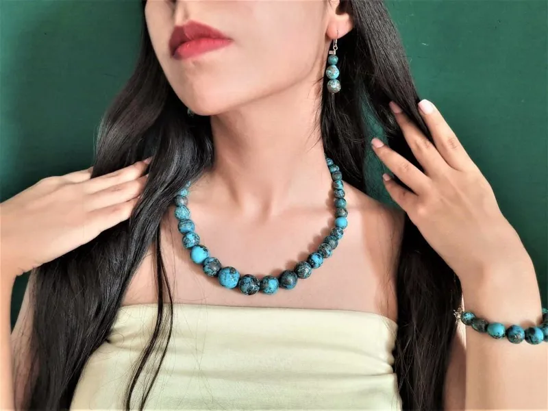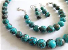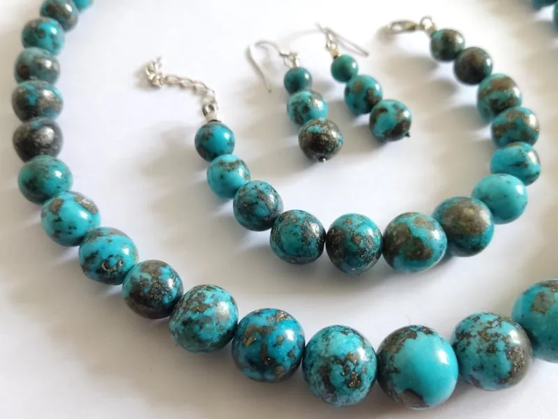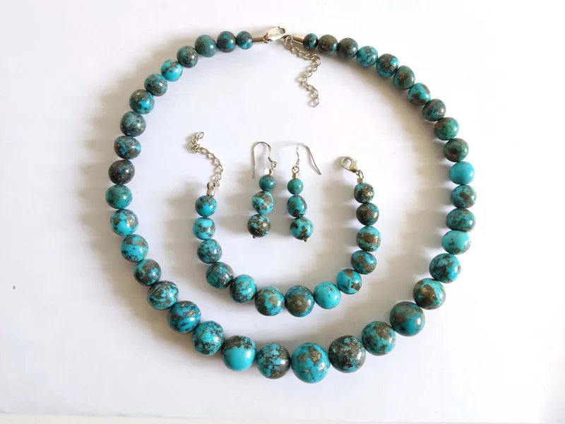 گردنبند و گوشواره و دستبند با مجموعا 58 مهرۀ فیروزۀ شجری پیریت دار تراش دست.