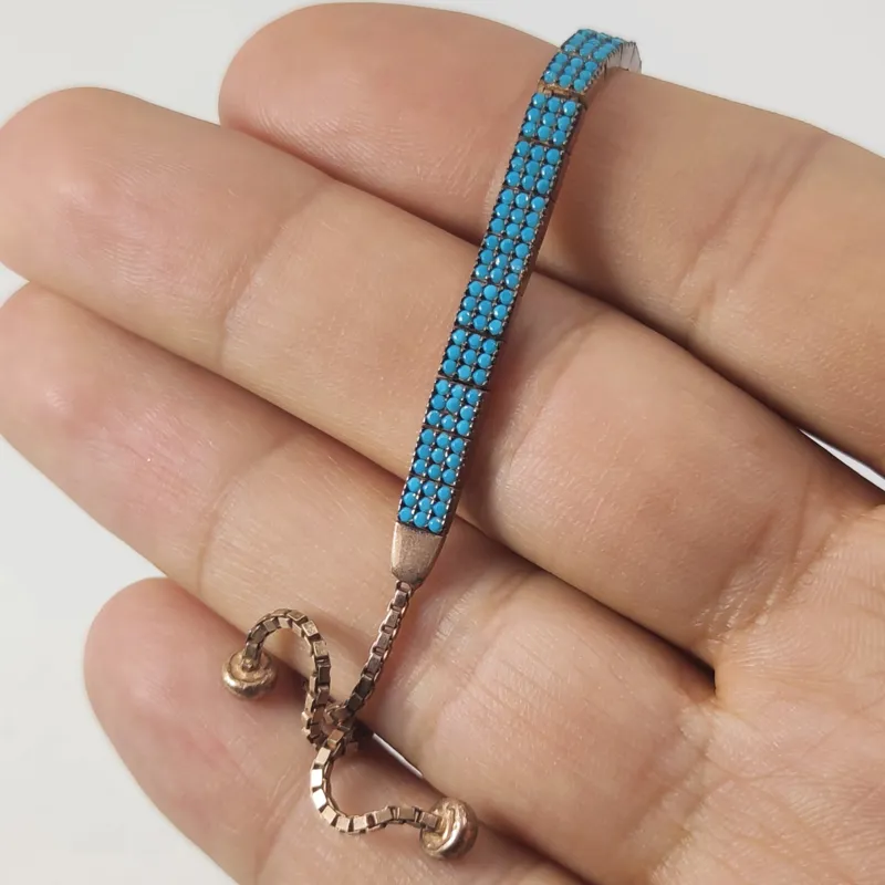 دستبند نقره، آبکاری رز گلد و فیروزه های سنتتیک