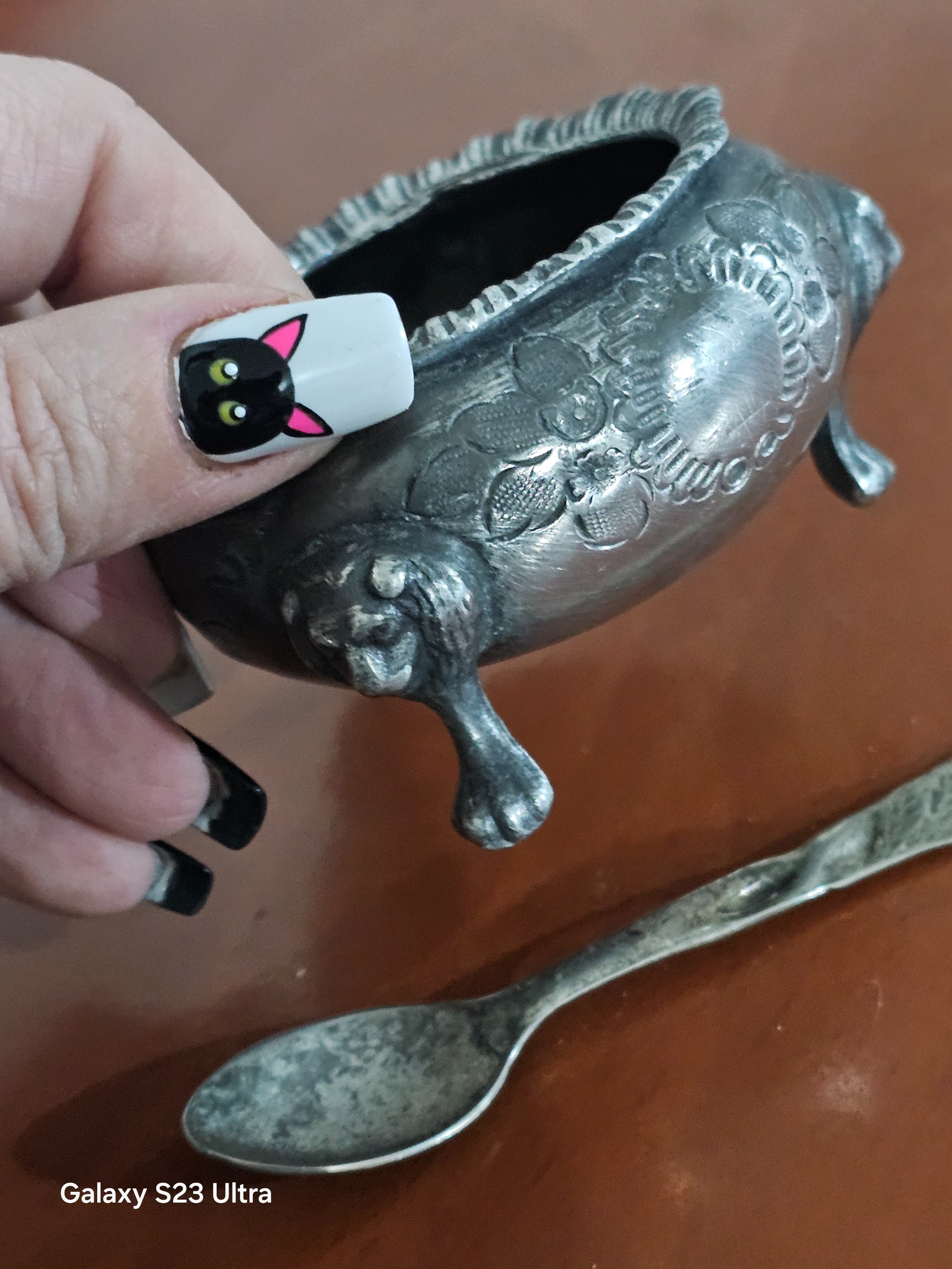 قدمت کار شاید بالاتره قدیمی پایه ها با کله شیر تزئین شده مارک داره آب نقره قوی کار مشخصه دیگه و اینکه مینیاتوری با قاشق سیلور