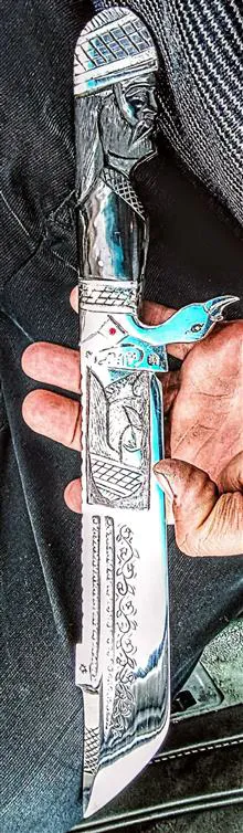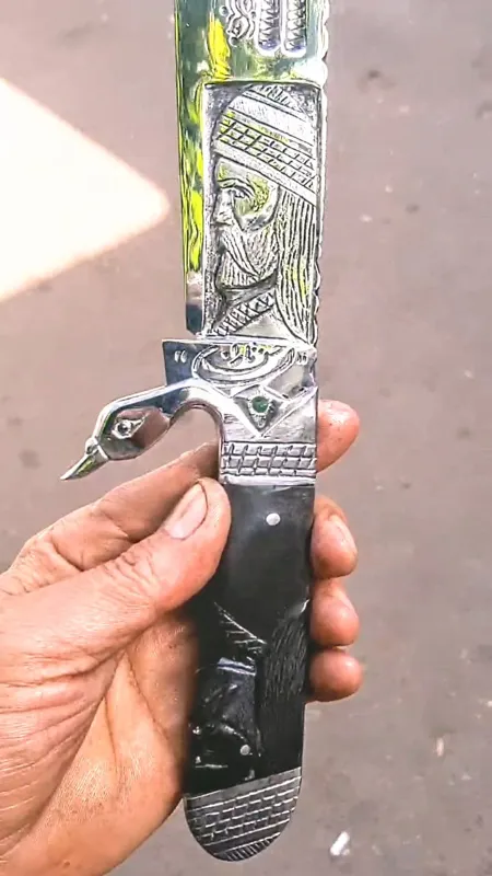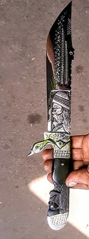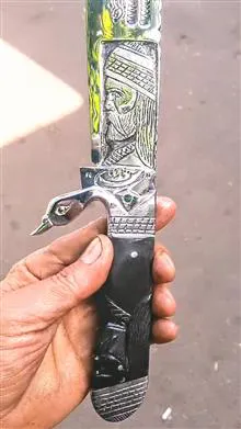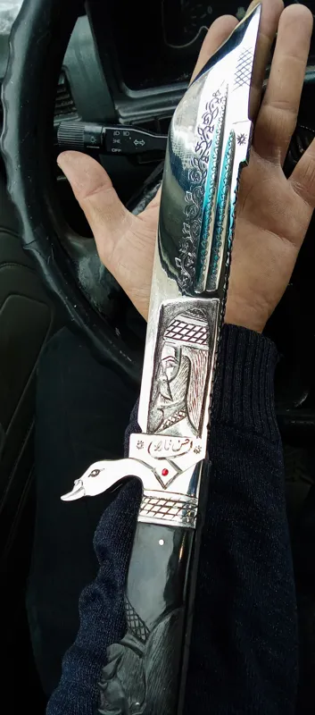 چاقوکارد کلکسیونی ونمایشی استادحسن تاران وکنده کاری سوهان کاری وجودان وخزینه کاری شده که کلا دستساز بوده دسته طرح شیخ ازجنس شاخ گاومیش باربندبشکل پرنده ازجنس استیل وتیغه رخ وگلمرغ طراحی قلمزنی شده ازجنس فنر جیپ که کاملا آبدیده واتش کاری شده درکنار کلکسیونی بودن کاربردی هم میباشد و به طول 40سانتدمیباشد که 35و25سانت این کار هم سفارش گرفته میشود وخواهشا از موجودی کالا قبل خرید اطلاع داشته باشین که درصورت اتمام موجودی سفارش کار7الی10روززمان میبرد