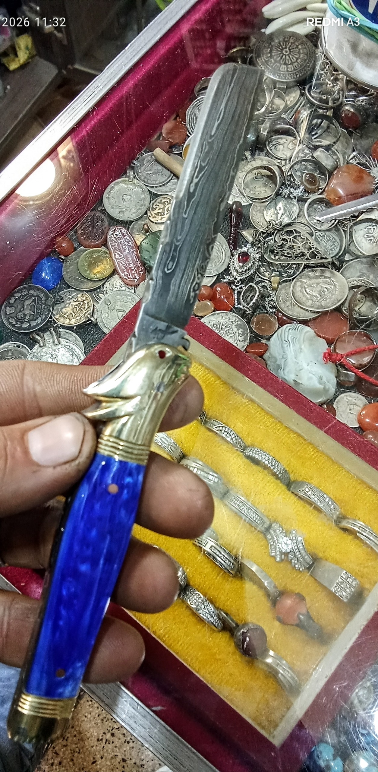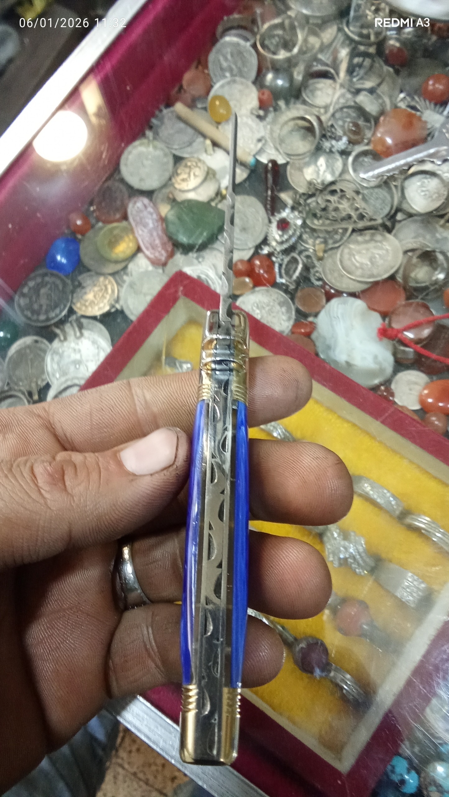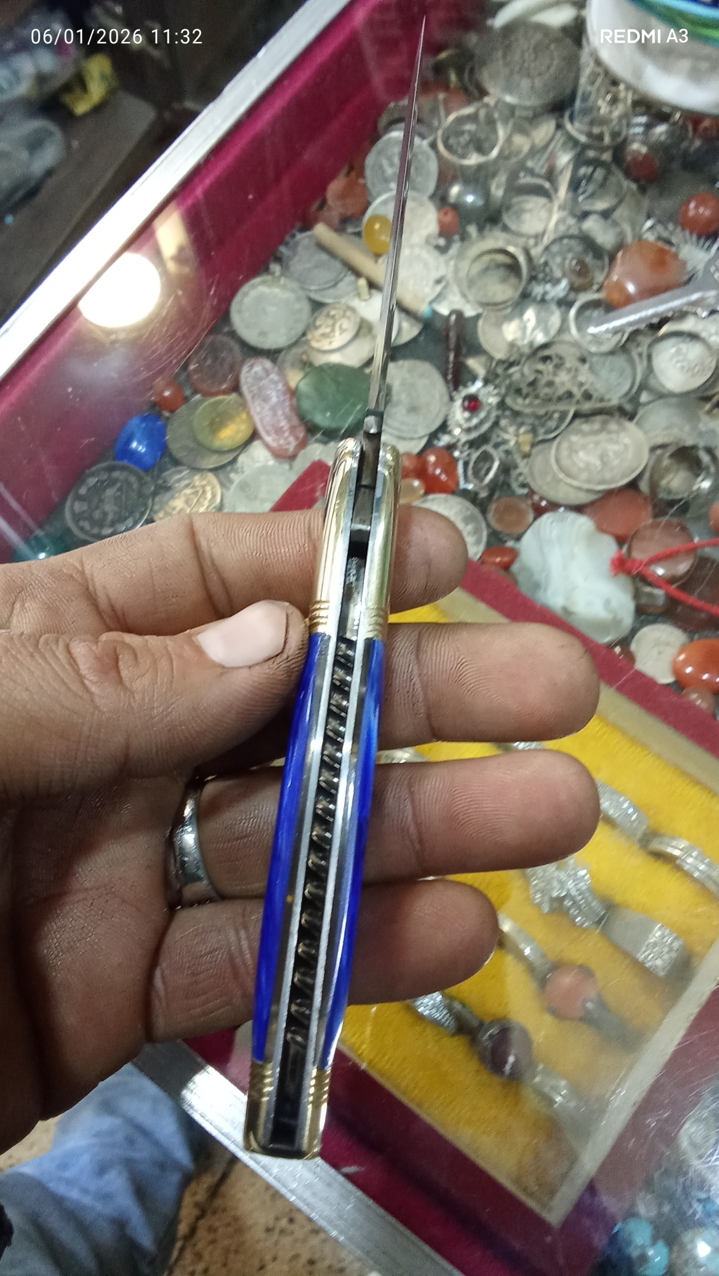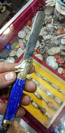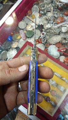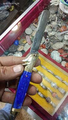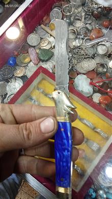 چاقوکلکسیونی وسفارشیداستادسیدابراهیم (آبی) دسته کهربا تیغه دمشقی اصل آلمان مدل قلمتراش باربند برنجی مدل خرگوش فنر قوی بازوبست شلاقی کیپ بدون درز ولقی 18سانت