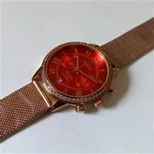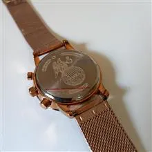 توجه داشته باشید بند این ساعت در واقع چرم بوده است که به دلیل نقص فنی تعویض گشته است و بنده یک عدد بند حصیری مسی رنگ برای آن انتخاب و نصب کردیم که از نظر فنی و ظاهری بسیار زیبا شده و مناسب این ساعت میباشد