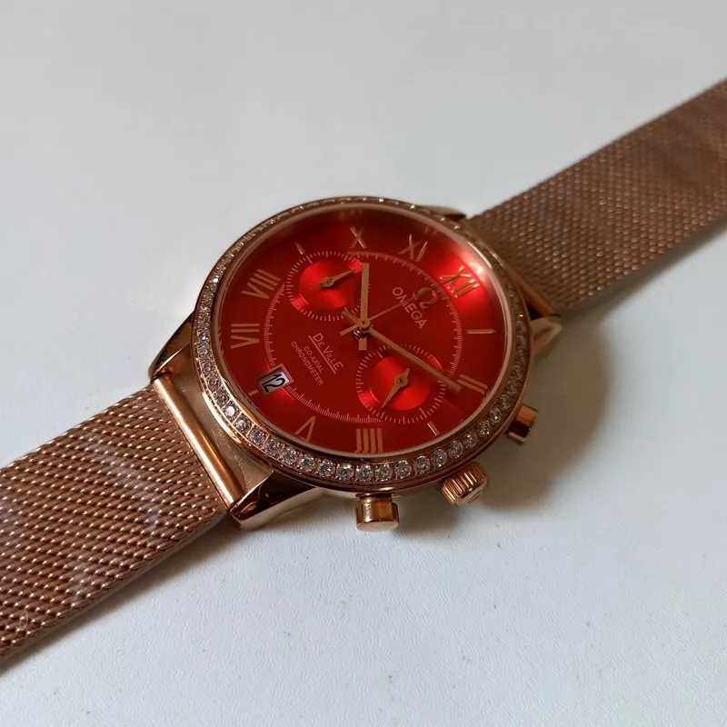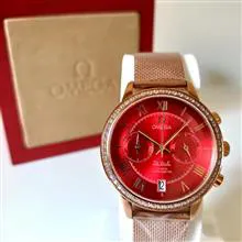 در صورت تمایل خریدار بند چرم با هر رنگی میتوان روی آن نصب کرد که اینجانب آنرا انجام خواهم داد ضمناً یک عدد امگا با همین مدل با صفحه گلبه ای در فروشگاه ما موجود میباشد که بند چرم فابریک خودش را دارد