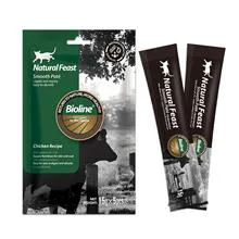 این محصول یک میان وعده خوشمزه و نرم و به صورت پوره برای گربه هاست. به ر احتی خورده میشود و حتی برای گربه های مسن و دارای مشکل دندانی مناسب است. با بسته بندی تیوپی ، میتوان آن را مستقیما به گربه داد یا روی غذای اصلی آن اضافه کرد.