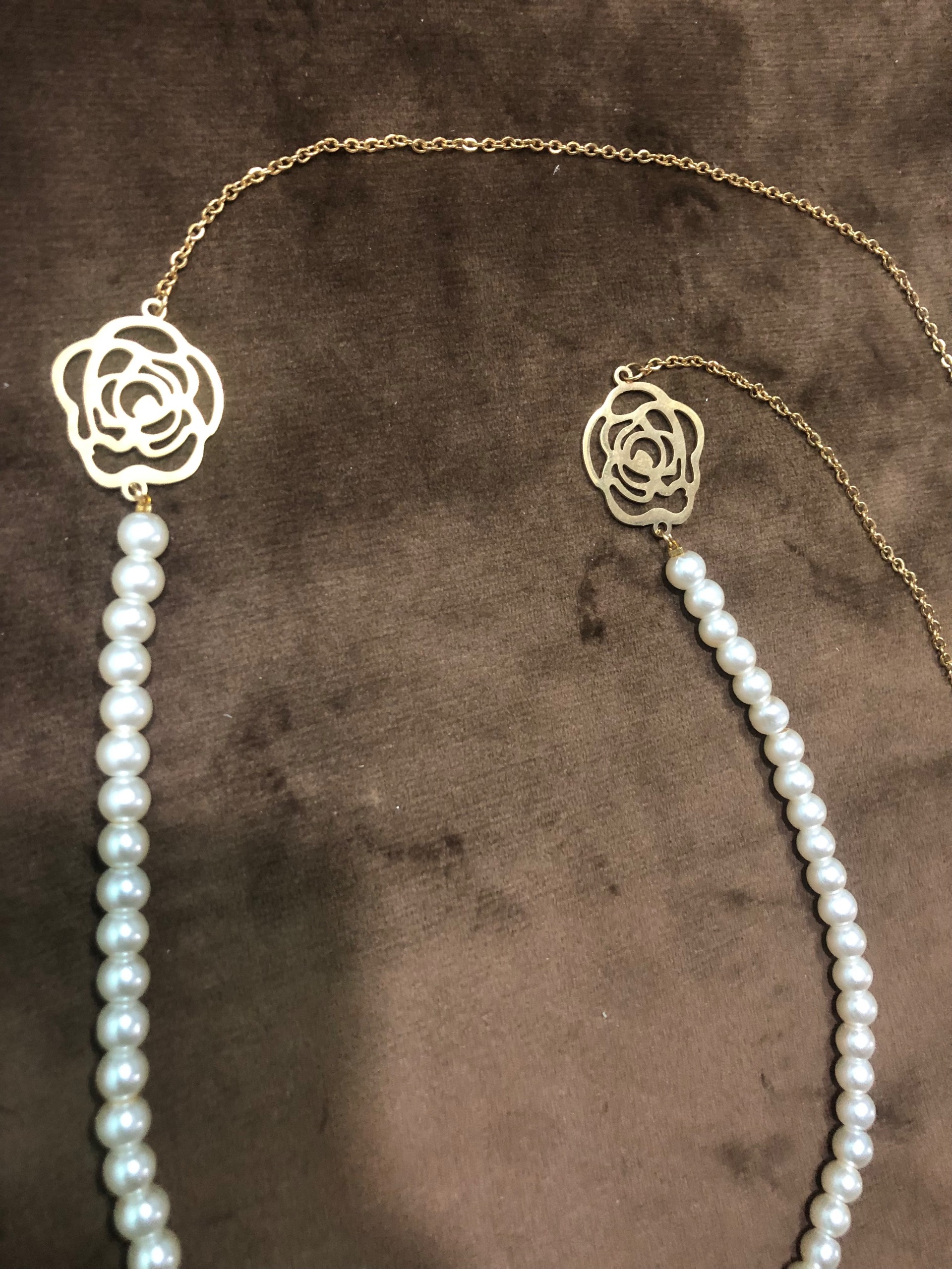 یراق آلات : مروارید شیری سایز متوسط، قفل استیل، پلاک استیل،زنجیر استیل طلایی
