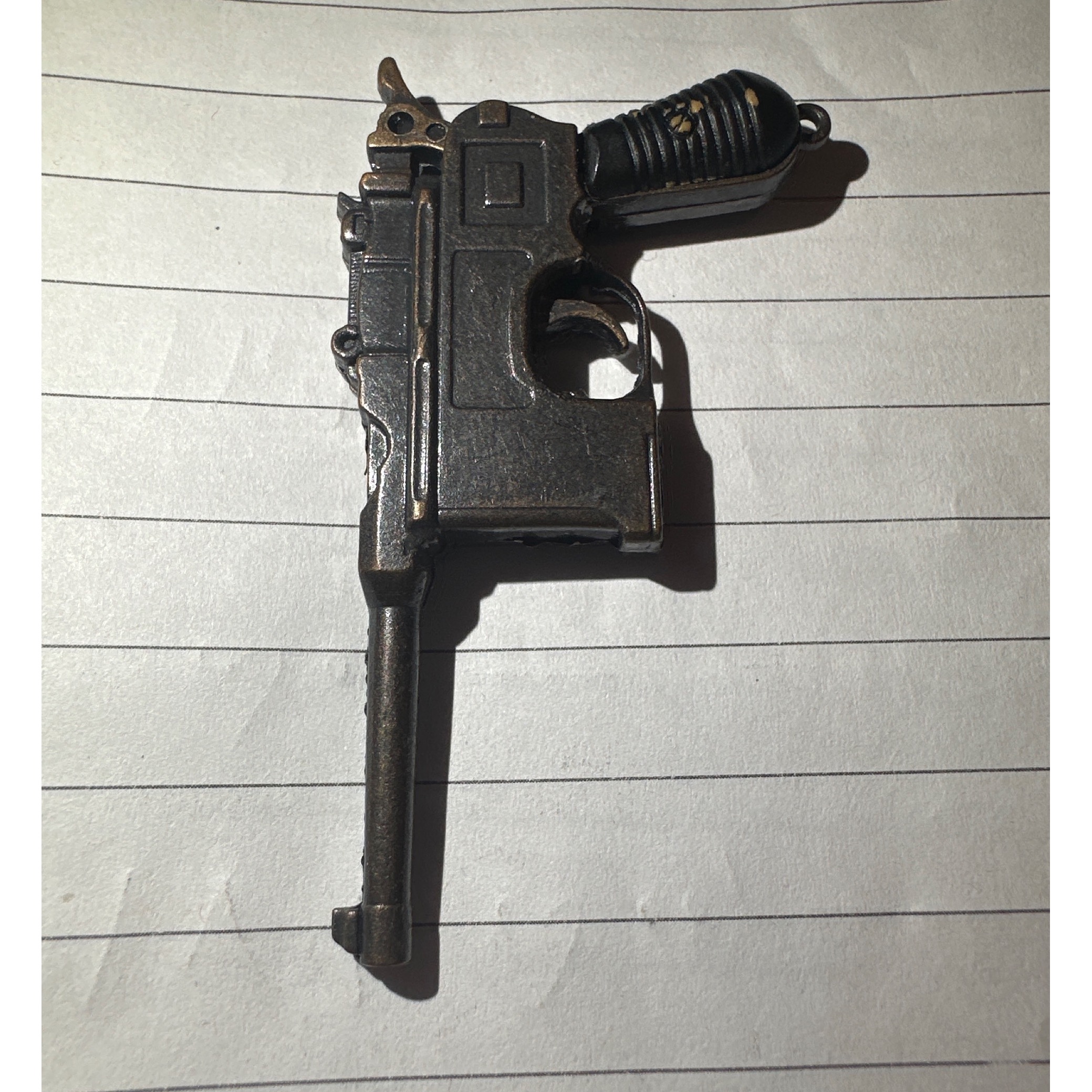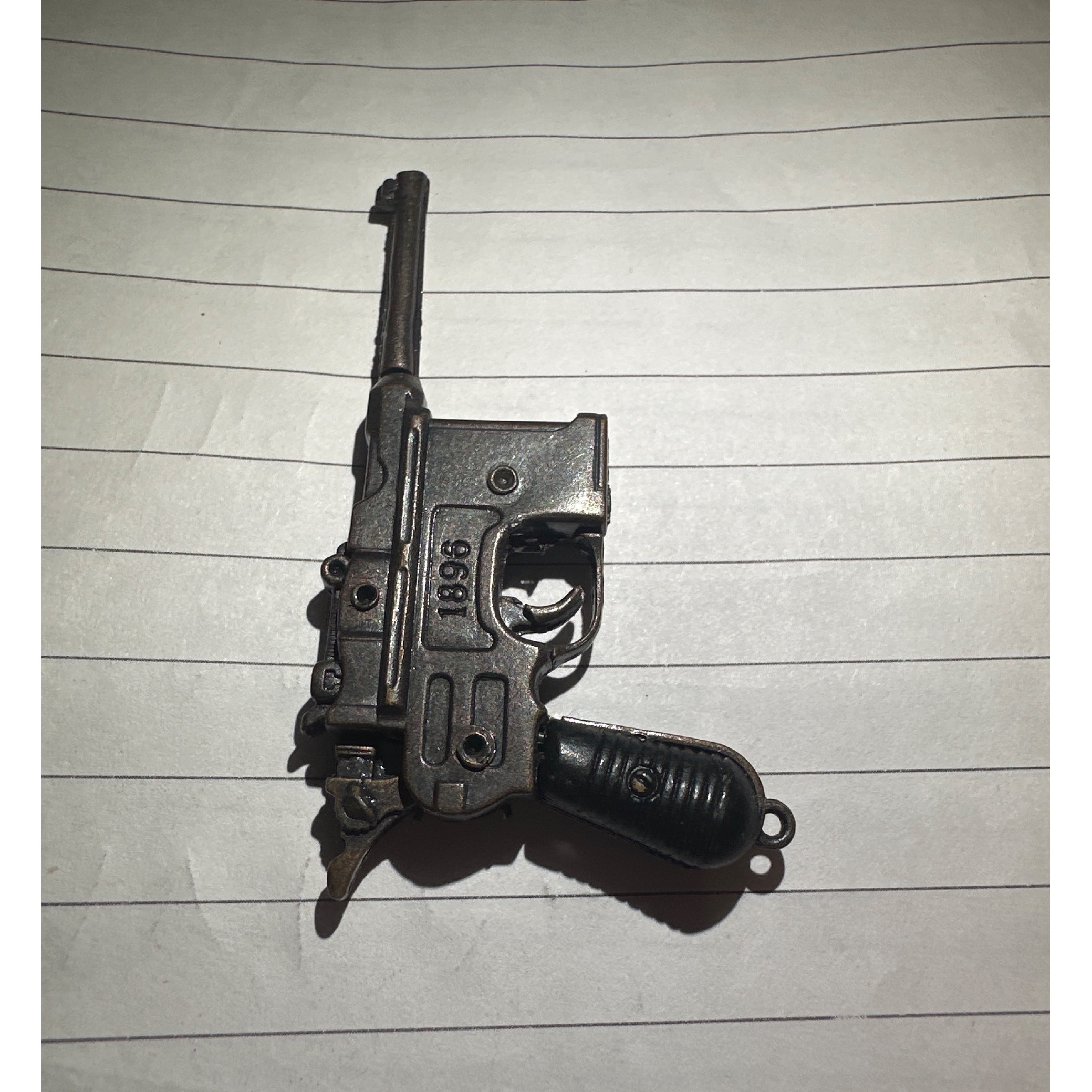 ماکت تفنگ فلزی ، فاصله هر خط در عکس 1 سانتی متر میباشد .گلنگدن و ماشه متحرک میباشد . دکوری و ترقه ای هم میباشد.