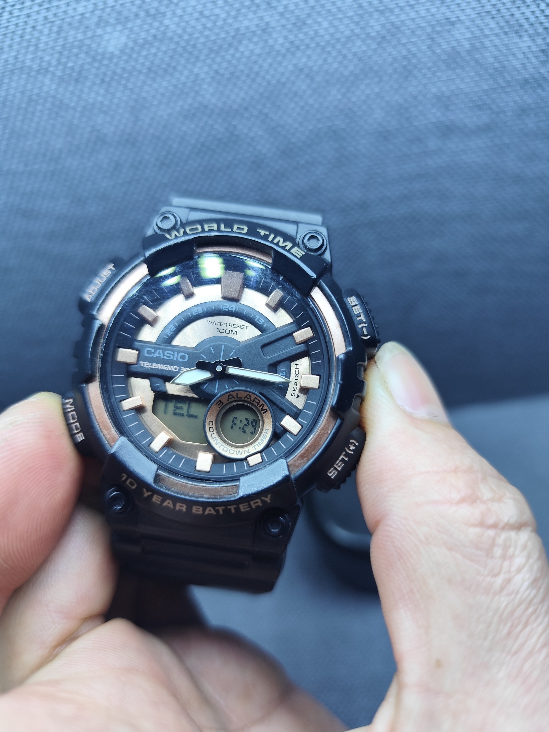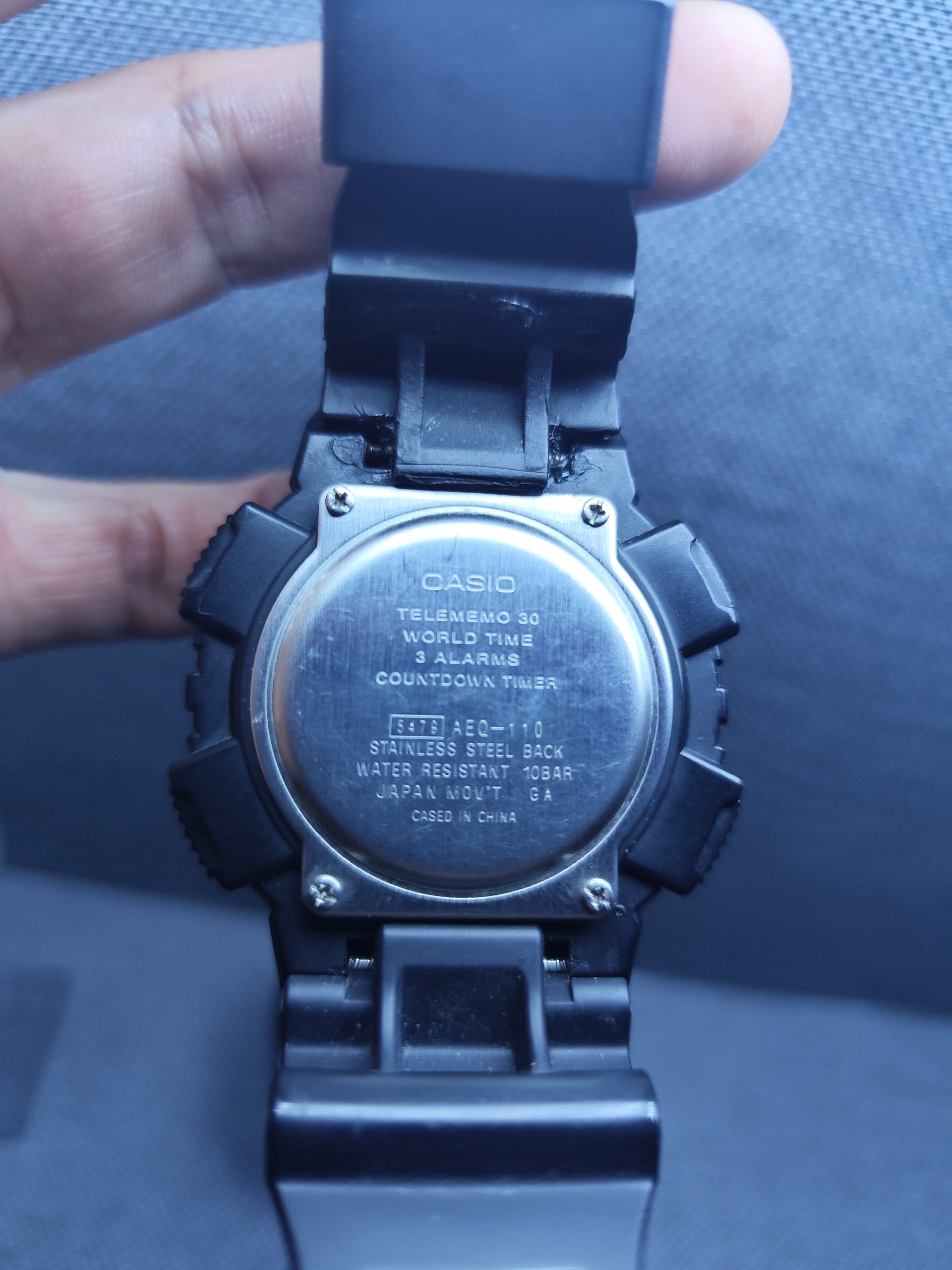 کاسیو مدل AEQ-110 داری 30 حافظه تلفن.اصلی.دارای گلس ضد خش.بند ترک داشته و چسب خورده.میتونید عوضش کنید.تو اینترنت موجوده.اصلی هستش.عقربه شب تاب.نو این مدل 9 تومنه.بخاطر بند این قیمت گذاشتم