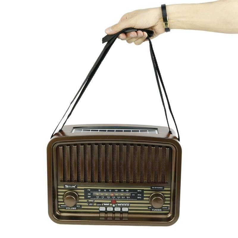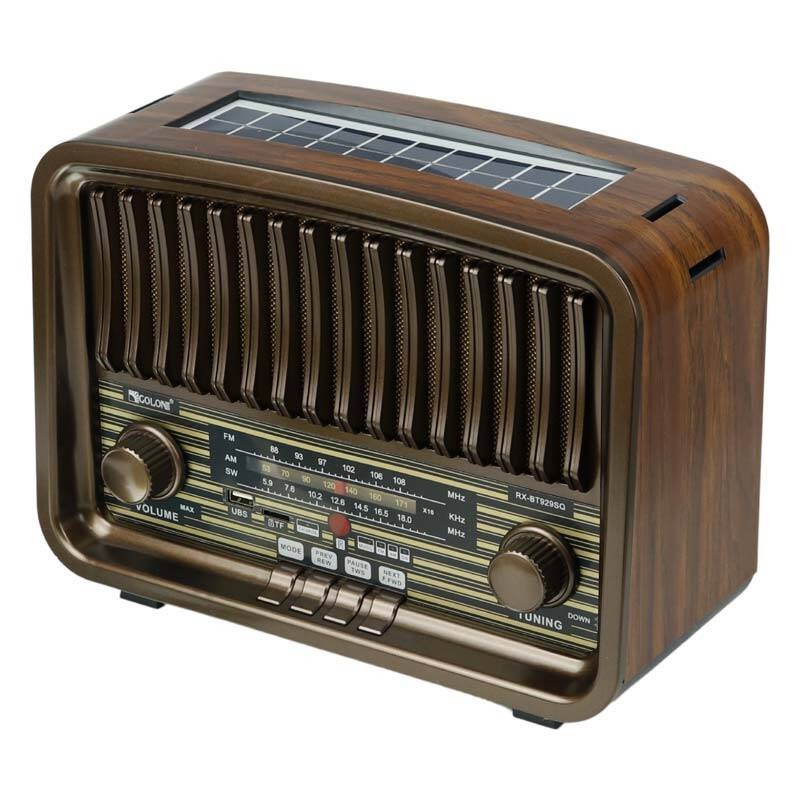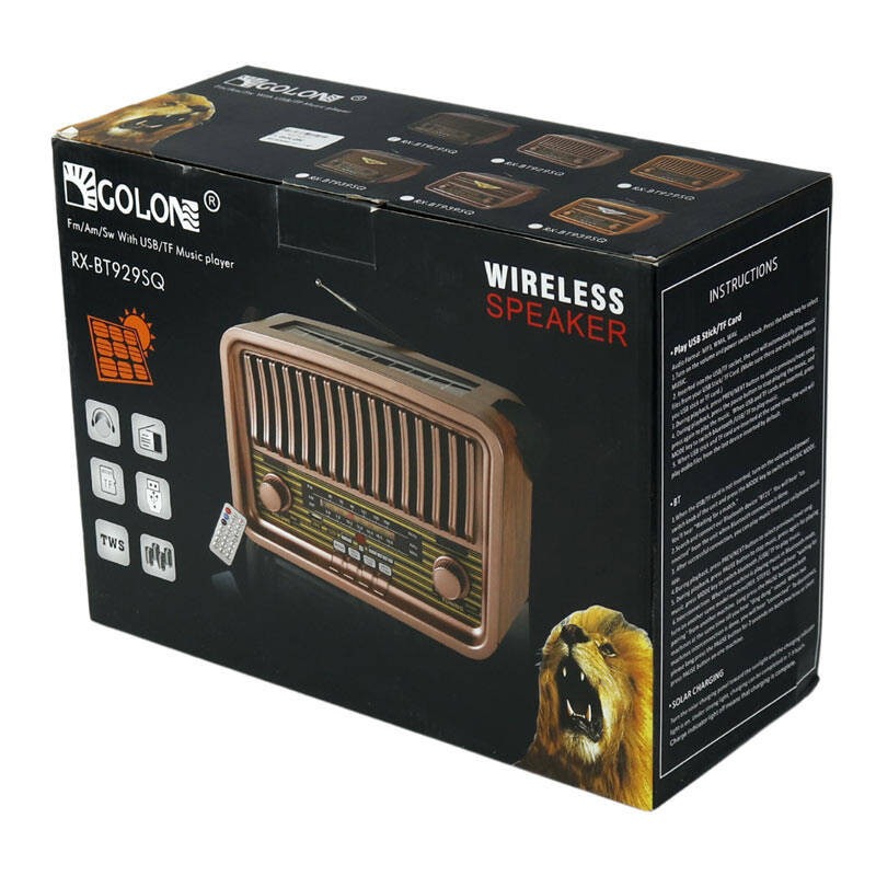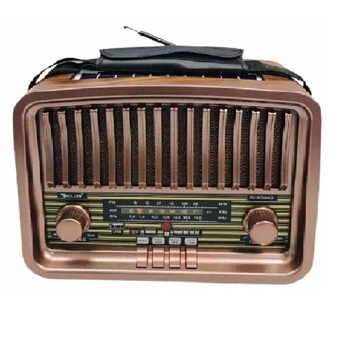رادیو اسپیکر بلوتوثی قابل حمل قابل استفاده رودوشی رادیوسنتی طرح قدیمی 3 باند قابلیت اتصال کارت حافظه از نوع TF قابلیت اتصال از طریق بلوتوث پخش موزیک و صدا گوشی و دیوایس با اتصال bt می باشد. و همراه با یک سولار و همچنین DC آن 6 ولت است. و AC آن 100V 240V است . و باتری 18650 li است.