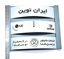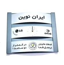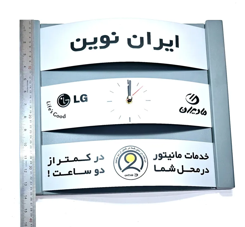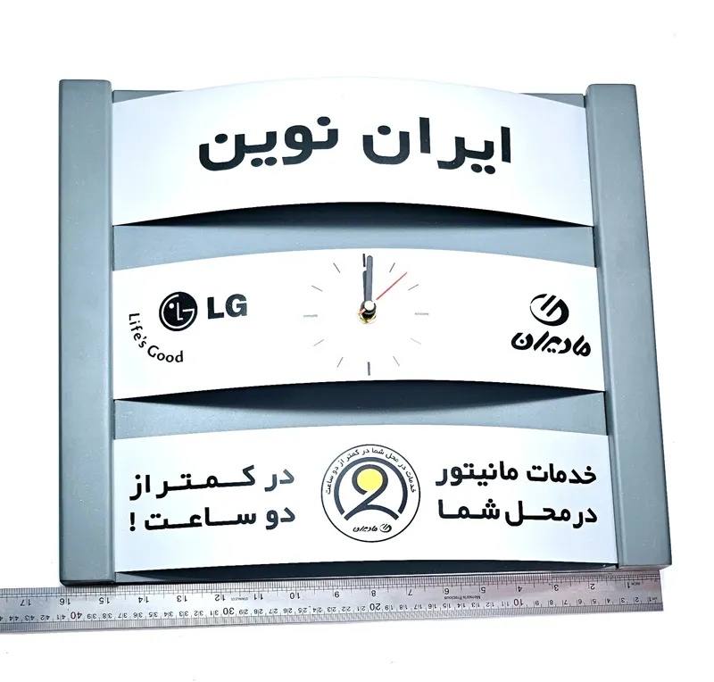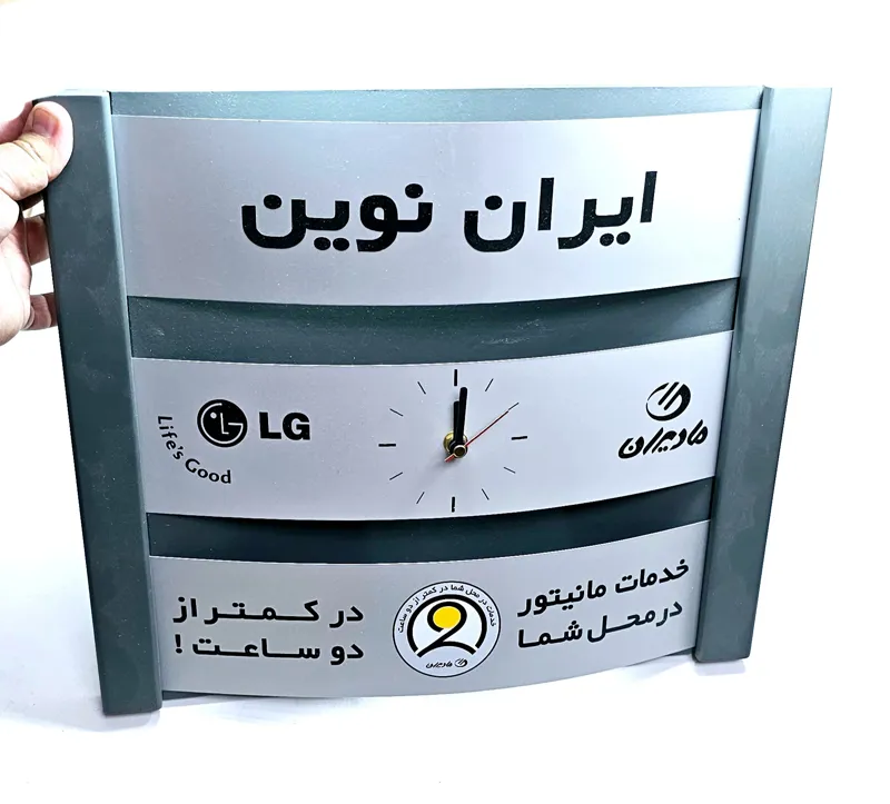 ساعت دیواری تبلیغاتی LG مادیران، ایران نوین با کیفیت عالی , کاملا سالم ، جنس قاب اصلی ساعت از جنس چوب و پنل های جلویی ساعت از جنس فلز میباشد