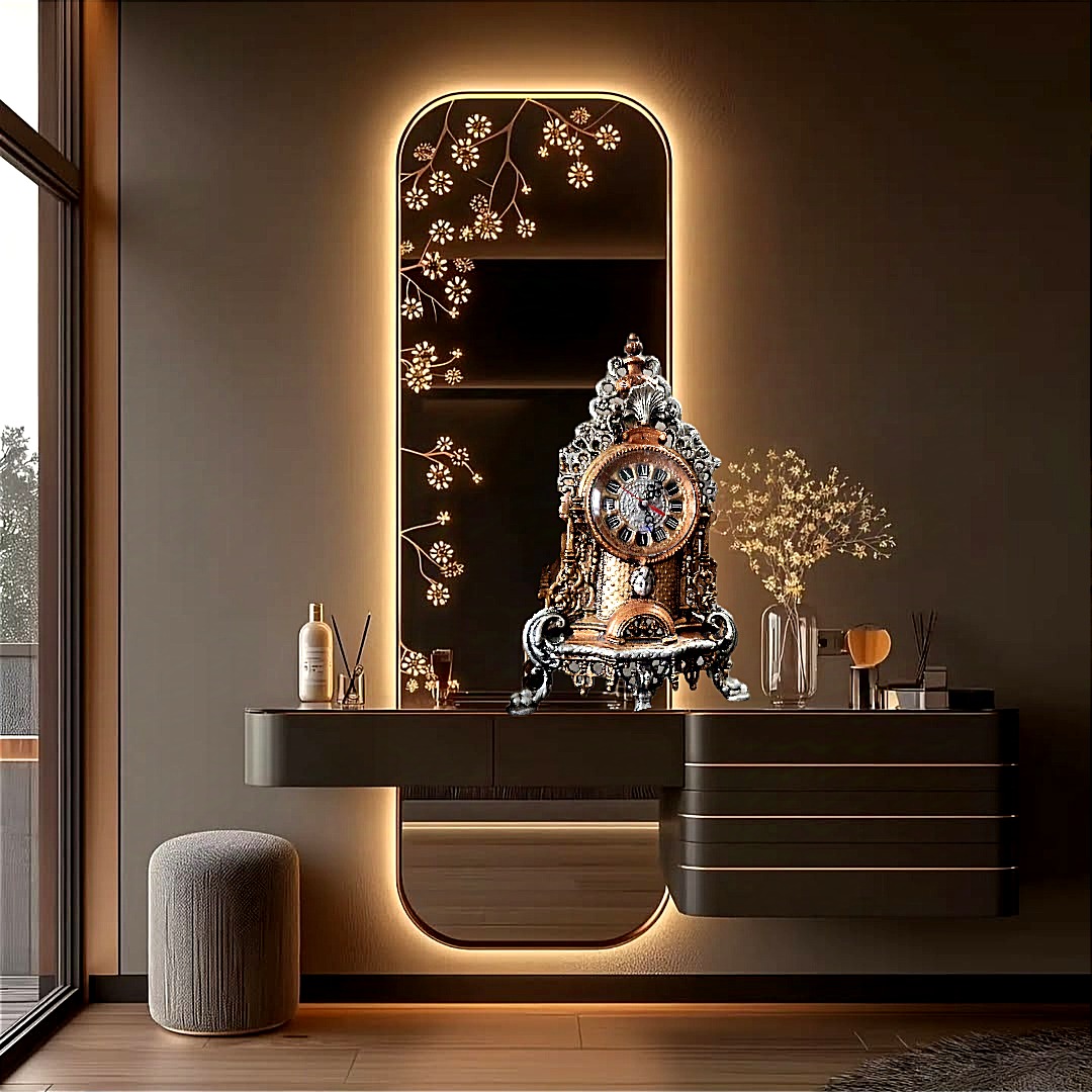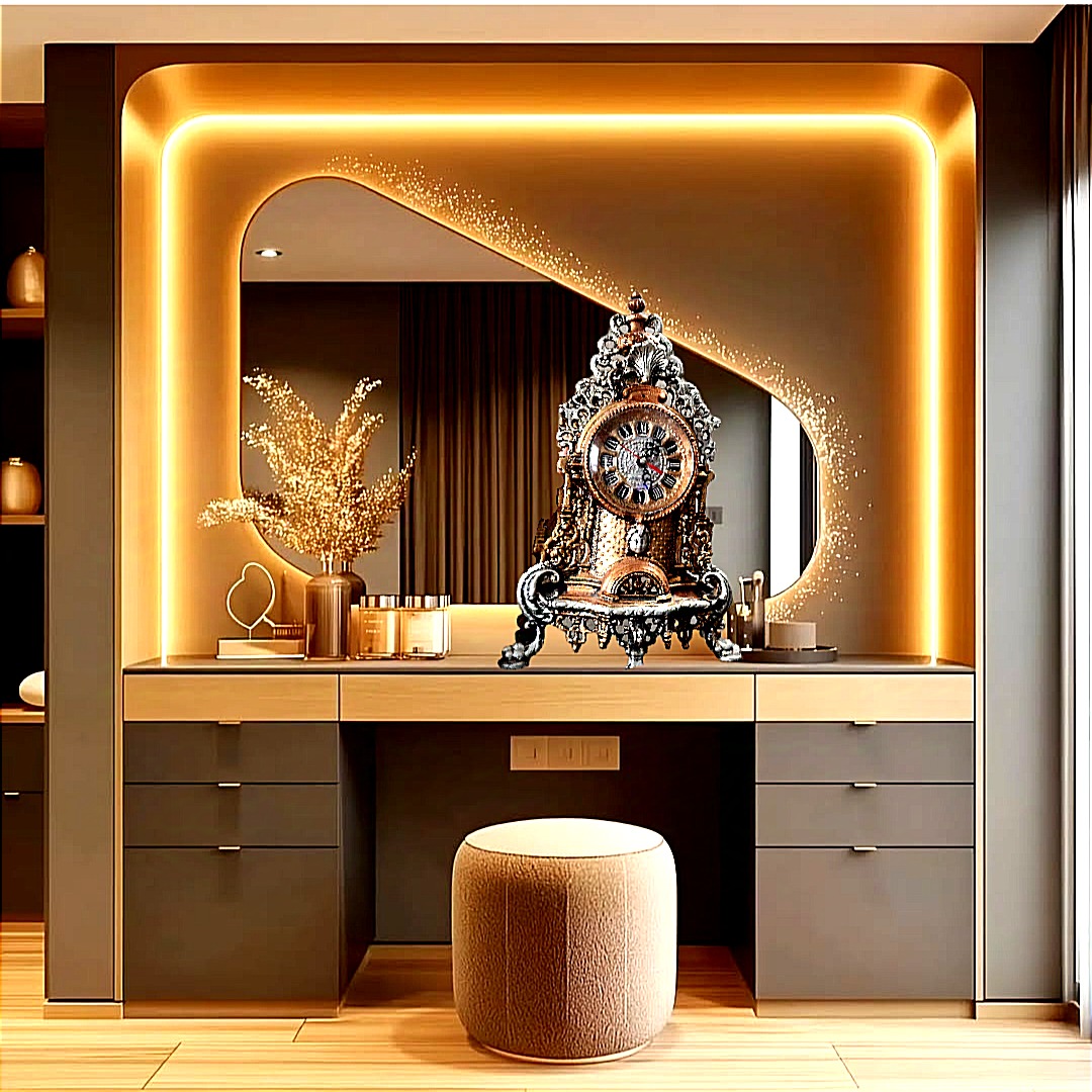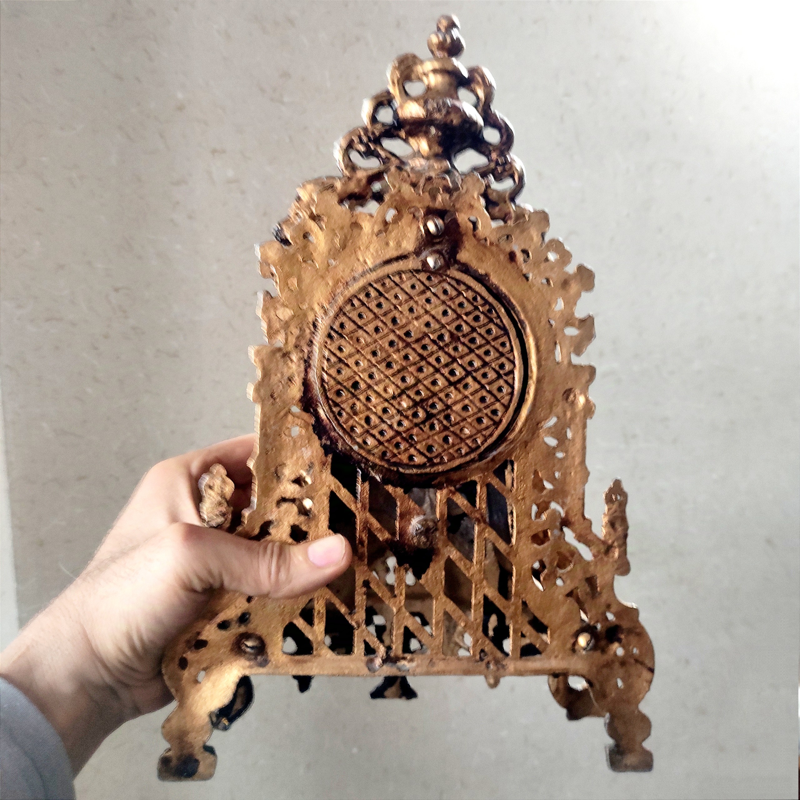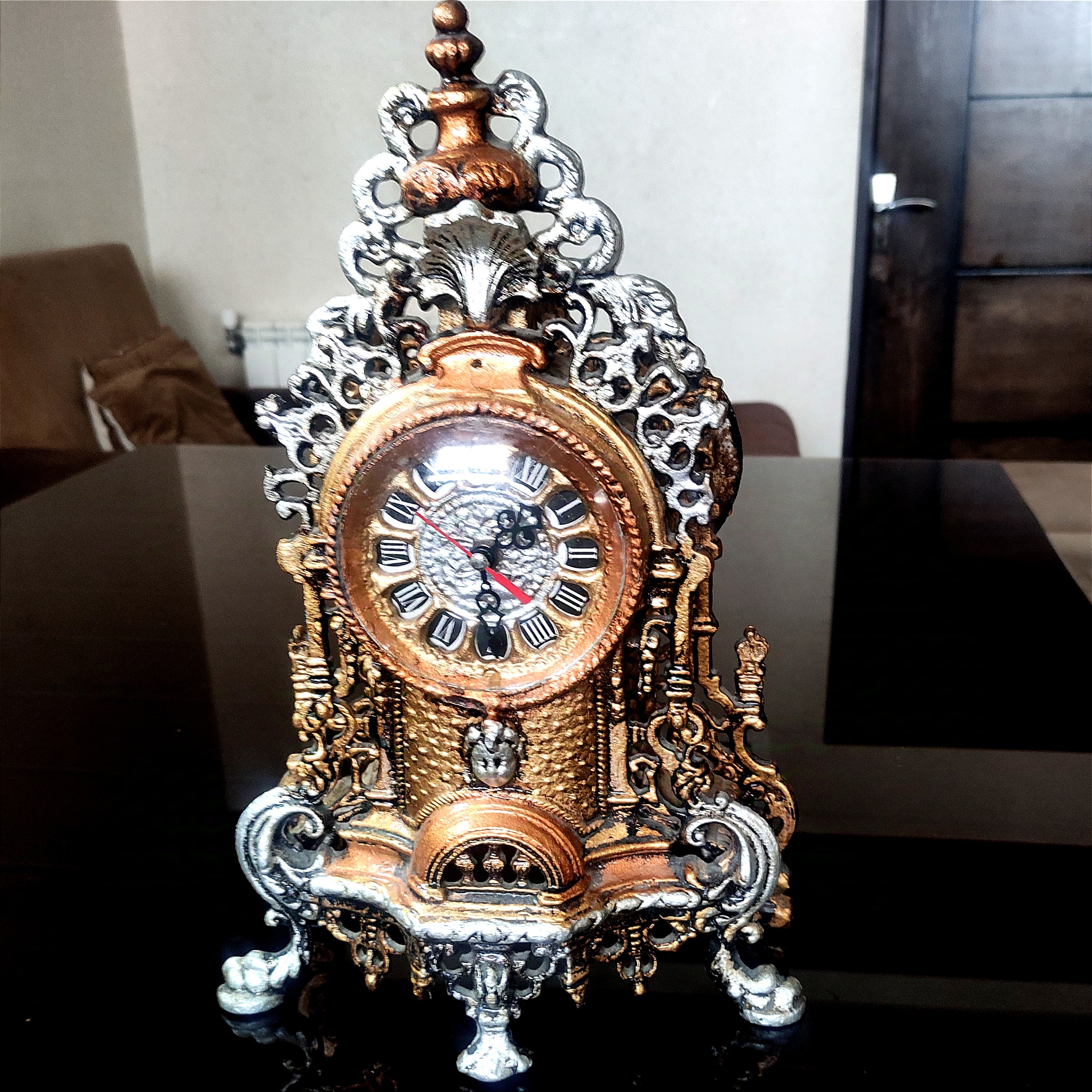 ساعت رو میزی وزین و جون دار و فوق العاده زیبا و شیک و کلاسیک ست با انواع دیزاین مدرن و سنتی منزل ، مخصوص روی انواع کنسول و تاج ویترین مناسب برای روی کنسولهای شومینه ، میزهای آرایشی ، سالن و اتاقهای خواب یا پذیرایی.... ، در قدیم این مدل فرانسوی با آینه و شمعدان ست میشده است ، ساعت آن از یک باتری قلمی سایز AA تغذیه میشود. ساخت ایران جنس آلومینیوم