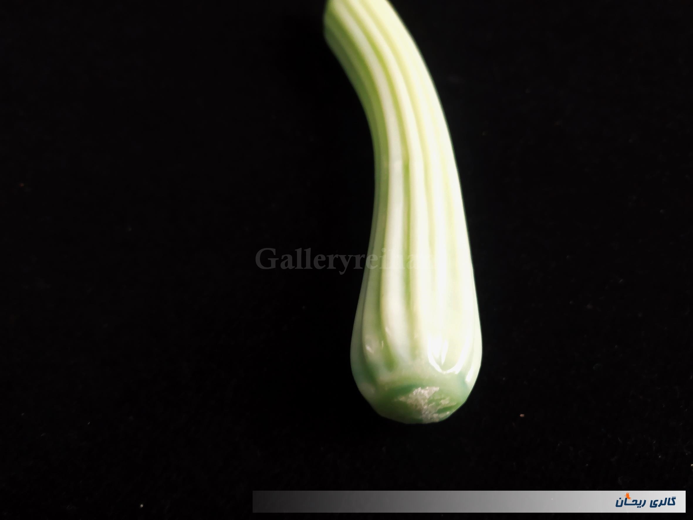 کاملا دست ساز است و به حالت دمیدن شیشه است بسیار ضخیم است و در ابتدا فکر می کنید که تو پر است ولی چون ضخیم است چنین احساسی میکنید در صورتی تو خالی است و رنگ بسیار زیبایی دارد و جنس آن از بارفتن (مخلوط شیشه و خاک چینی) است