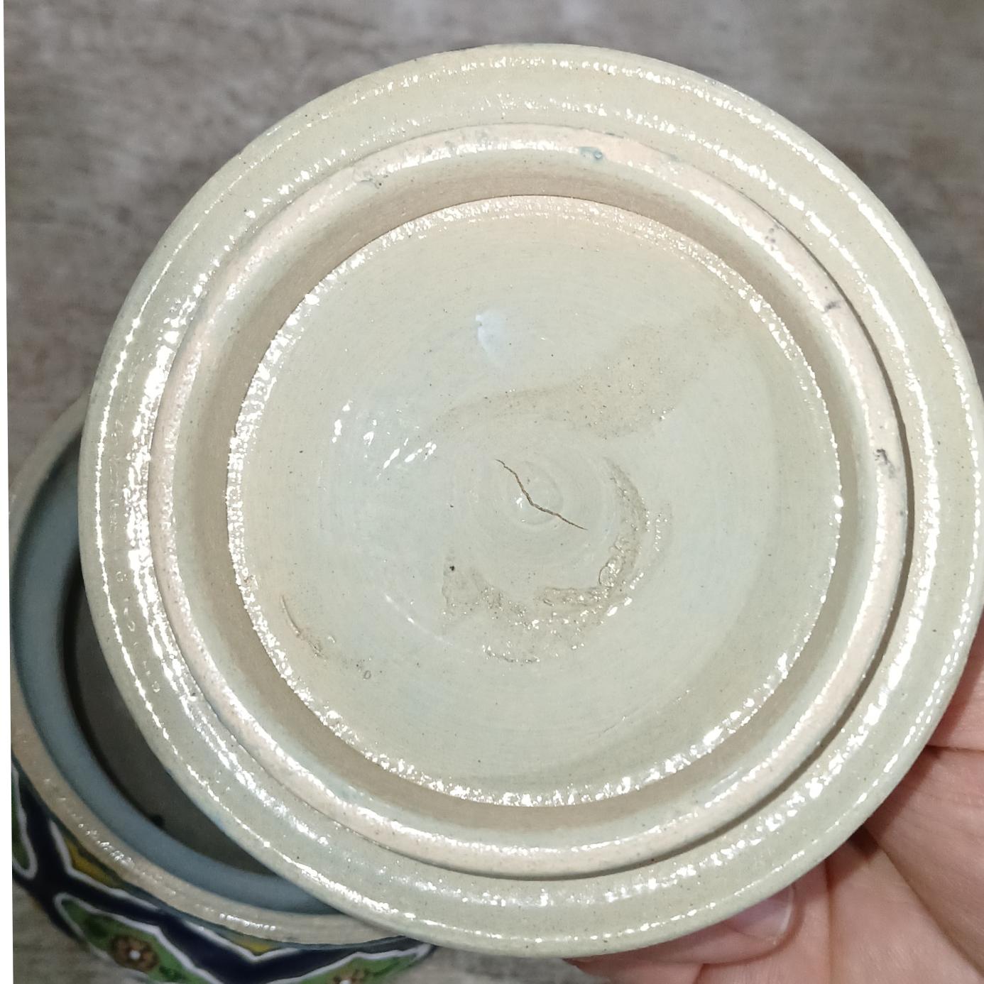 ظرف شکلات خوری سفالی کوچک سنتی و دست ساز. ابعادش تو عکس ها مشخصه. از تمام زوایا عکس گرفتم از محصول. دقت کنید یه ترک کوچیک داخل درب ظرف هست که از ابتدا هم بوده و در اثر ضربه نیست. سوالی اگه هست در خدمتم.