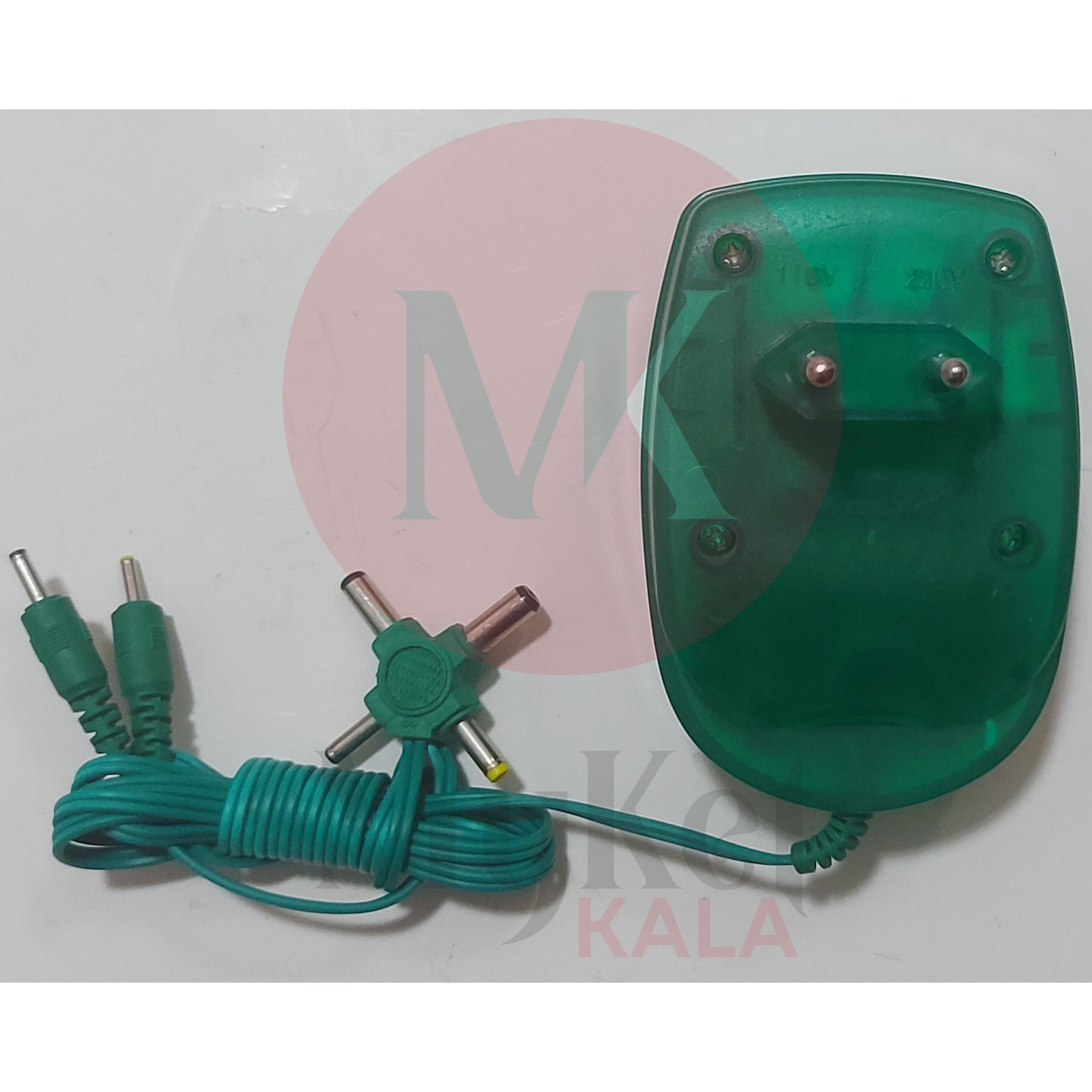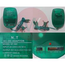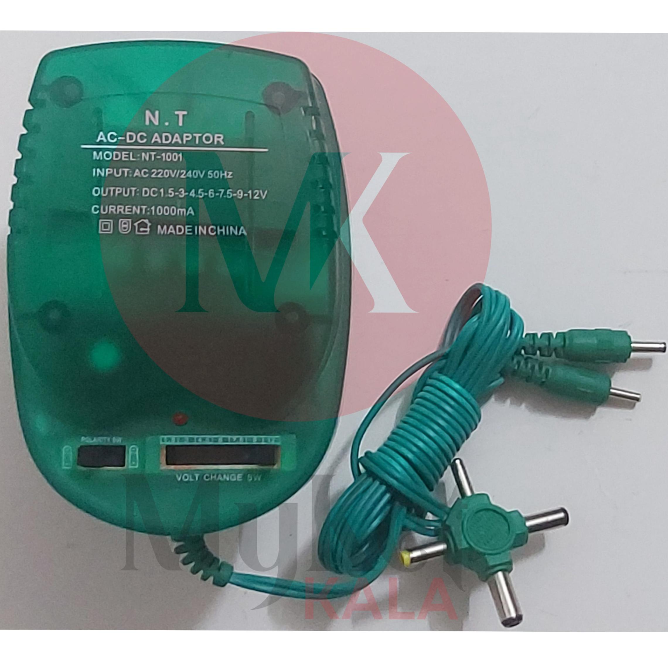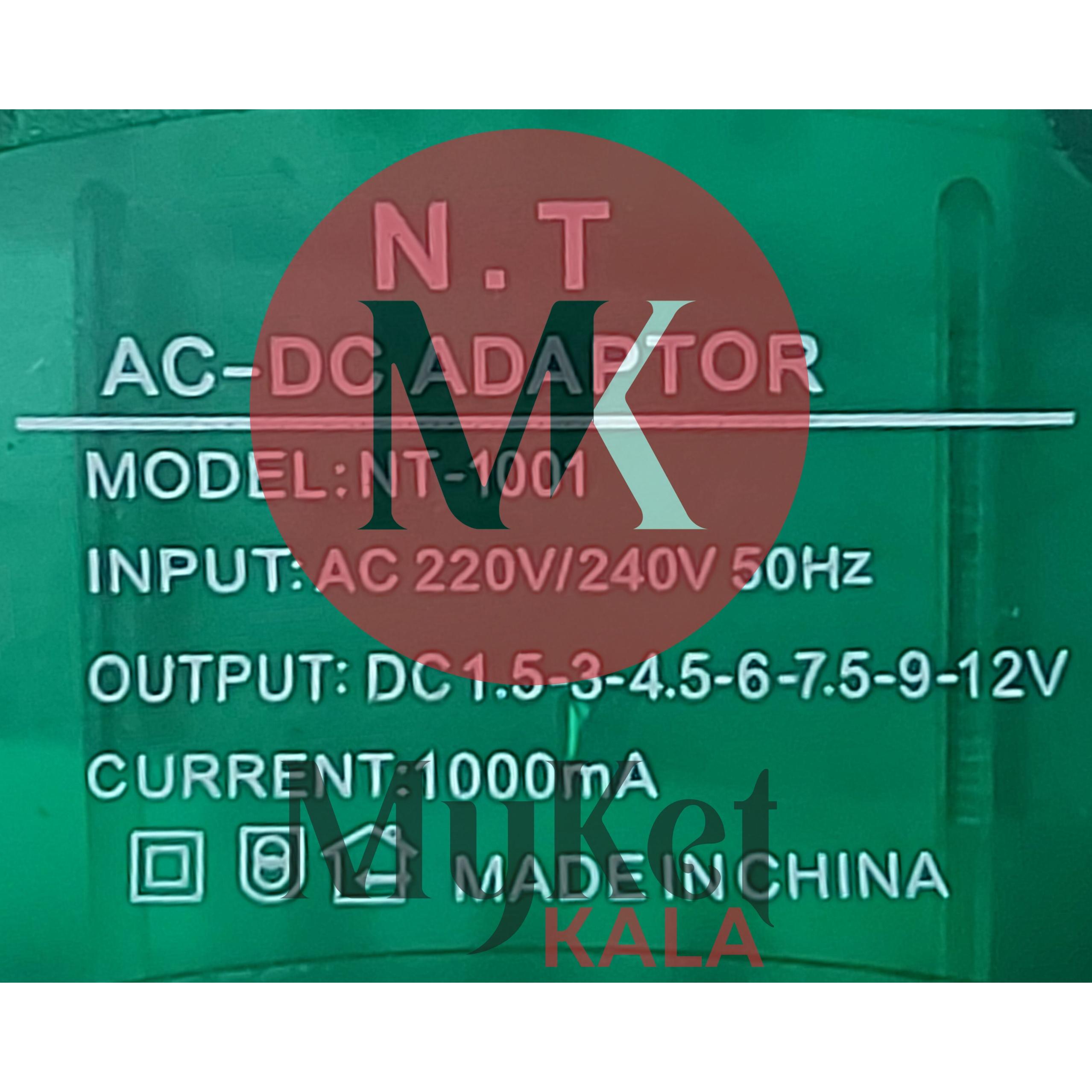 آداپتور N.T با جریان خروجی 1000 میلی آمپر با قابلیت تعیین و انتخاب ولتاژ خروجی از 1.5 الی 12 ولت با 6 مدل فیش مختلف جهت اتصال به هر نواع وسیله برقی