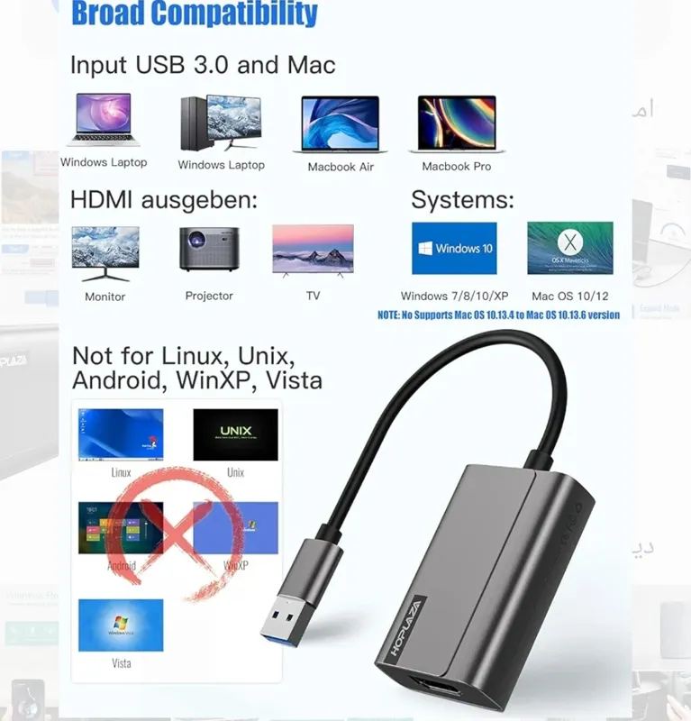 سازگار با سیستم عامل مک و ویندوز: آداپتور HOPLAZA HDMI به USB سازگار با ویندوز 10/8/8.1/7. Mac OS M1، Mac OS X v10.8/v10.9/10.10/v10.11؛ سیستم عامل مک 10.12/10.13/10.14/10.15. (No از نسخه Mac 0S 10.13.4 تا Mac 0S 10.13.6 پشتیبانی می کند). توجه: با Linux، Unix،