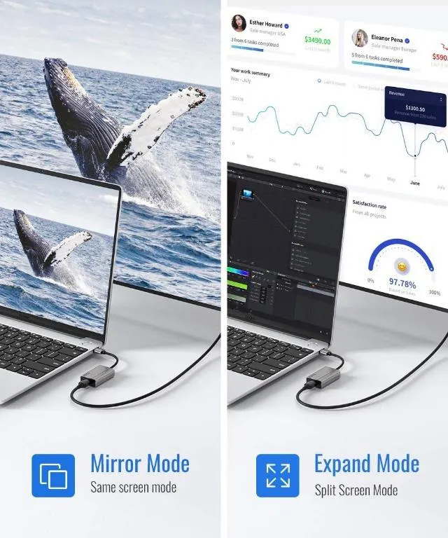 حالت Mirroring و Expansion: آداپتور USB 3.0/2.0 به HDMI از دو حالت نمایش پشتیبانی می کند: حالت آینه محتوای یکسانی را نشان می دهد، می تواند لذت بصری به شما بدهد، برای سرگرمی های بازی، سینمای خانگی، ویدئو کنفرانس، آموزش شرکت و غیره. حالت گسترش محتوای در حال
