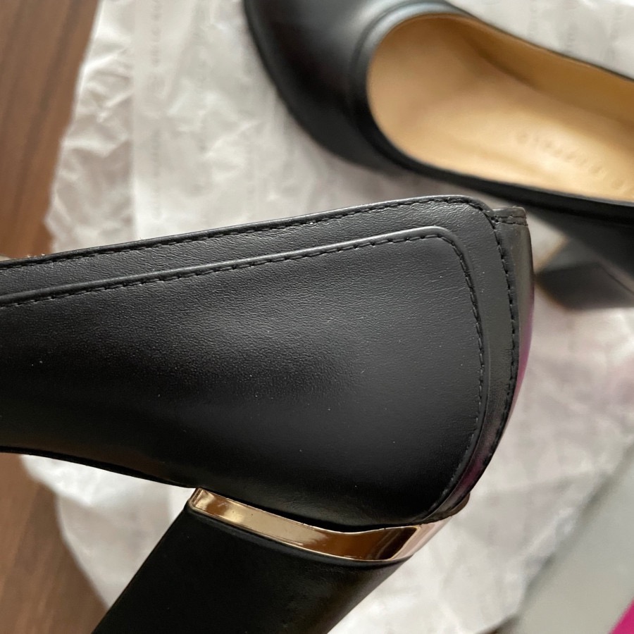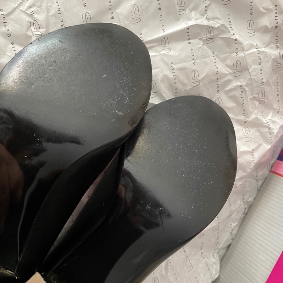 کفش زنانه، پاشنه دار، برند بوفالو سفید، مشکی با تزیینات طلایی، در حد نو واقعی ، سالم و بسیار تمیز، کف کفش به دلیل صیقلی بودن کمی سایش داشته ولی پاشنه کفش هیچ سایشی نداره و نشون میده که در حد یکی دوبار استفاده شده، داخل کفش هنوز بوی نوی متریال میده، پاشنه 8 سانته ولی چون کلفته توی پا و راه رفتن راحته، بسیار خوش پا و شیکه