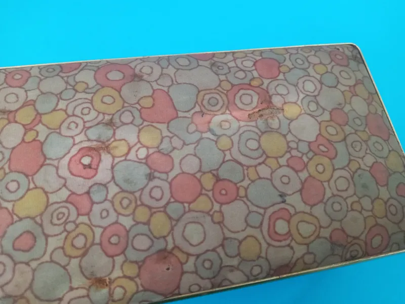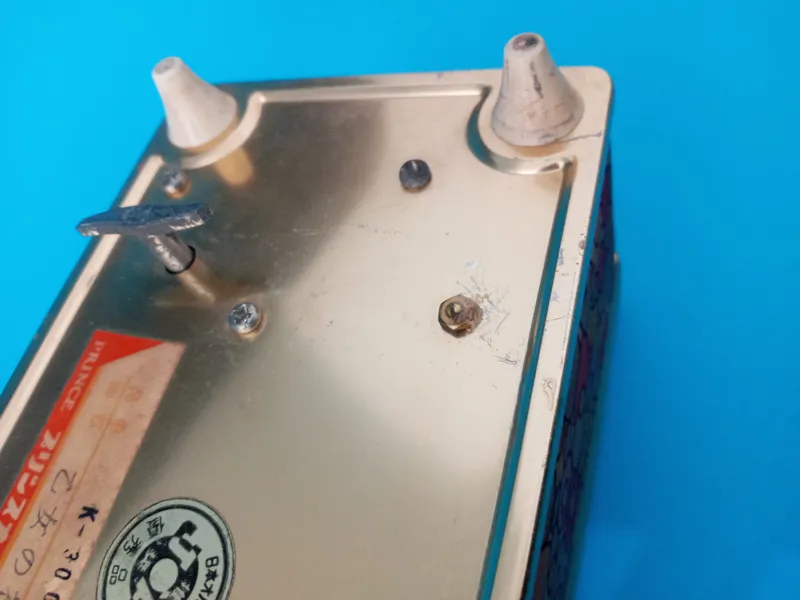 در مجموع جعبه سالم و کوک آن نیز سالم است. اما از اینکه دست دوم ذکر شده است، در عکس 4 و 5 نشان داده شده است که با بزرگ نمایی بهتر دیده میشود. رنگ پارچه بر روی درب جعبه پریده و کم رنگ تر از پارچه دور جعبه است و پارچه در چند نقطه، ساییده و سوراخ شده است. در زیر جعبه هم، همانطور که در عکس پنجم مشخص است، مقداری خط و خش بر روی فلز نمایان است.