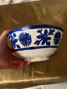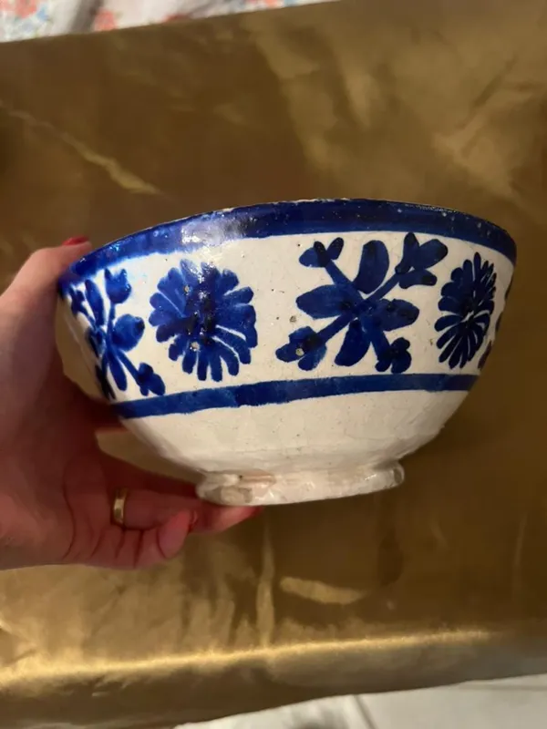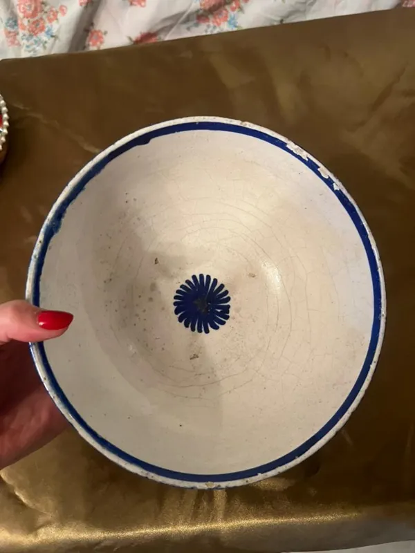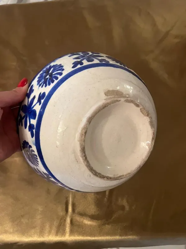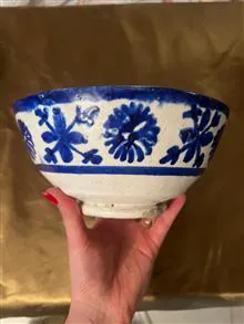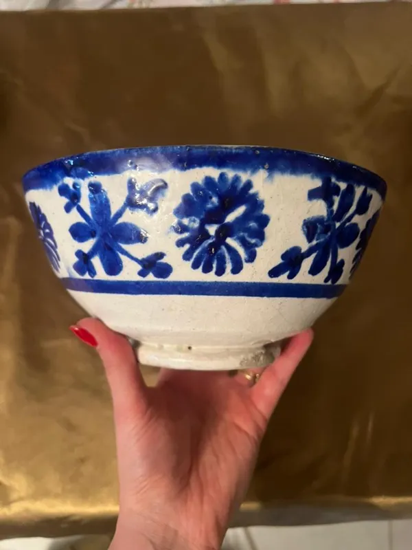 کاسه سفالی قلم آبی کهنه قاجاری کلکسیونی