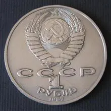 نشان ملی اتحاد جماهیر شوروی در سال 1956 وجود دارد، یک چکش و داس در پس زمینه کره زمین، زیر آن خورشید طلوع کننده، در بالا یک پنج ستاره نوک تیز، با پانزده  روبان گره خورده است، چرخش پایین بسیار گسترده تر است، که نماد РСФСР ( جمهوری سوسیالیستی فدراتیو شوروی روسیه است ) (بقیه چرخش ها جمهوری های دیگر هستند). در زیر نشان  عبارت  СССР مخفف (اتحاد جماهیر شوروی سوسیالیستی) درج شده است .  و در زیر عبارت 1 روبل و سال ضرب سکه 1987