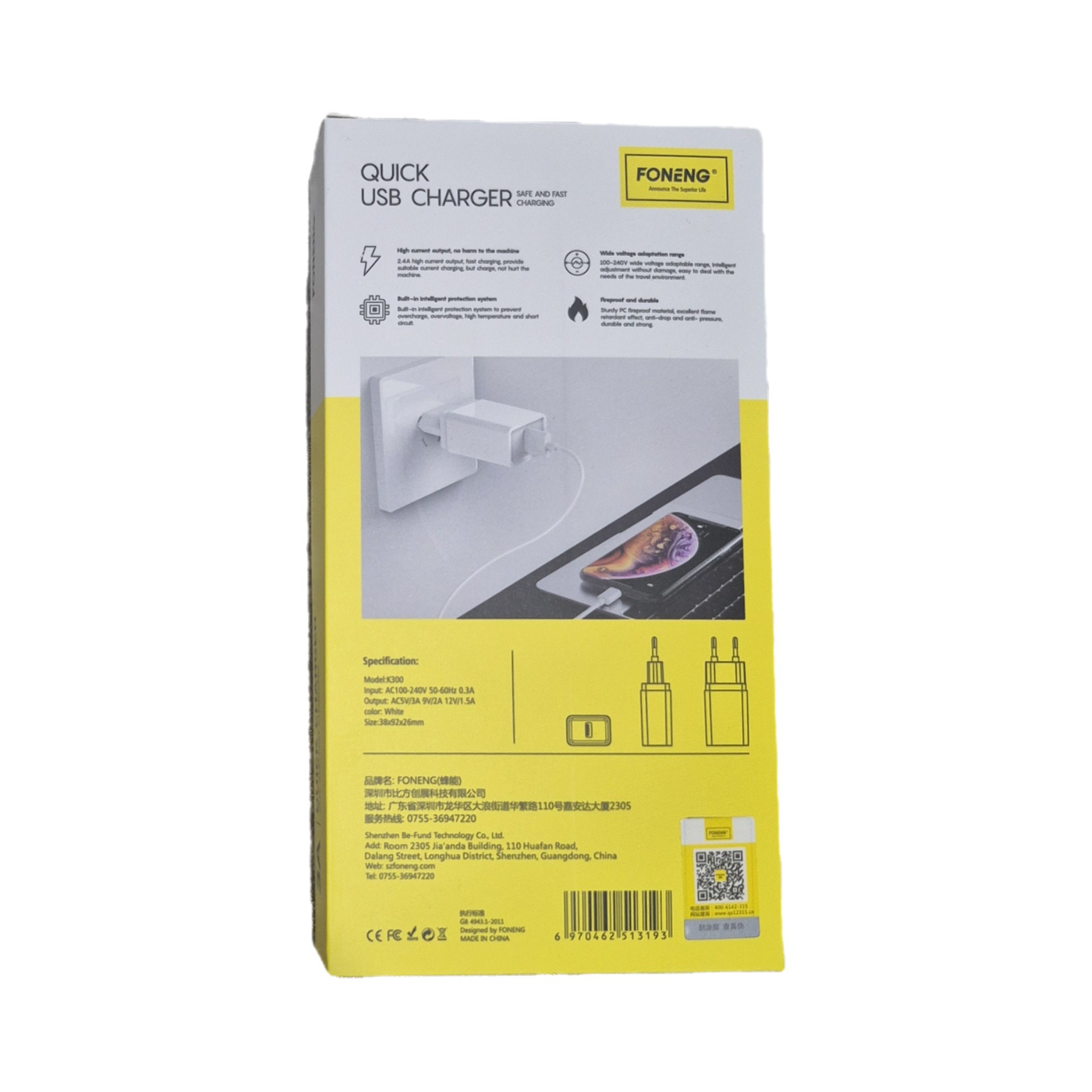 شارژر فوننگ مدل K300 با گواهیهای بینالمللی ایمنی، استانداردهای کیفی و حفاظتی را رعایت کرده و انتخابی مطمئن برای کاربران خانگی، اداری و مسافرتی محسوب میشود.