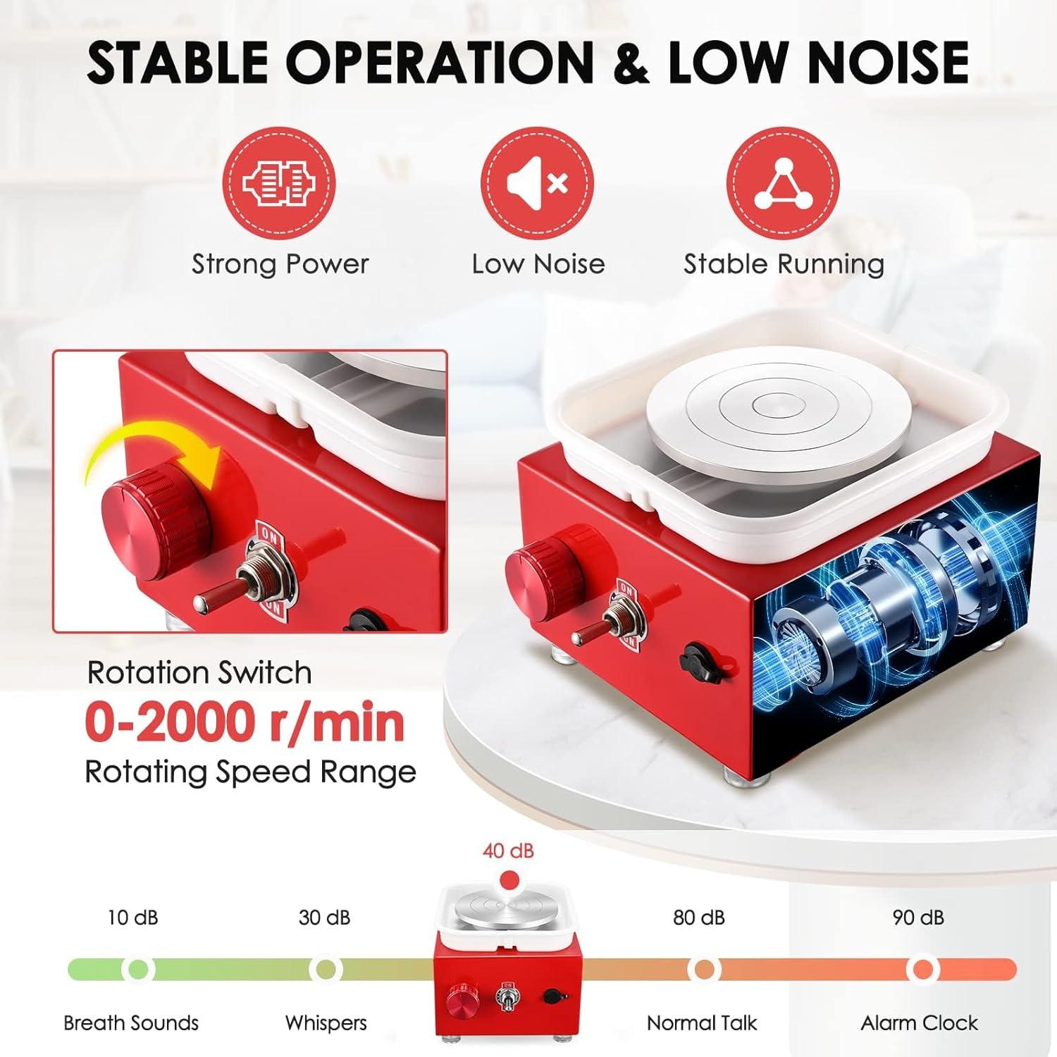 (عملکرد قدرتمند و صدای کم): این دستگاه سفالگری کوچک مجهز به موتور قدرتمند و سرعت قابل تنظیم است. حتی با حداکثر سرعت 2000 دور در دقیقه، دستگاه قالبگیری سفال برقی پایدار میماند. سطح صدای کم 40 دسیبل، یک تجربه خلاقانه راحت و آرام را فراهم میکند.