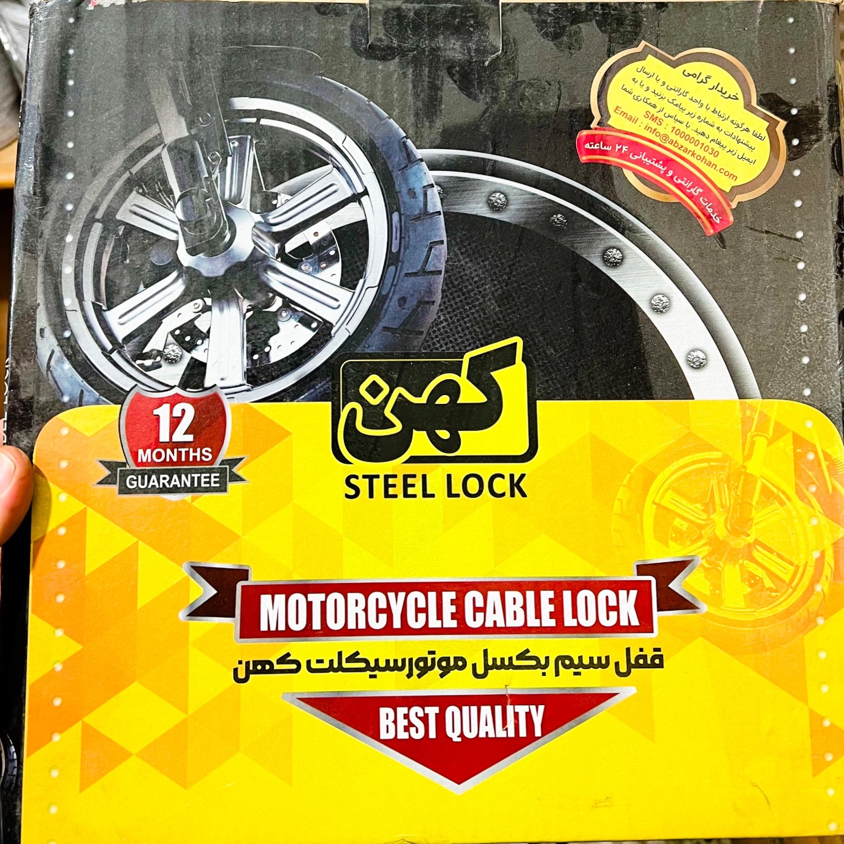 قفل سیم بکسلی موتور و دوچرخه از برند کهن با 12 ماه کارانتی و کارت طلایی معتبر بهمراه 2 کلید با طراحی خاص که در صورت مفقود شدن ،سریالی که روی کارت گارانتی طللیی اون نوشته شده به شرکت اعلام میکنید شرکت براتون میفرسته قفل ایرانی با کیفیت و امنیت بسیار زیاد