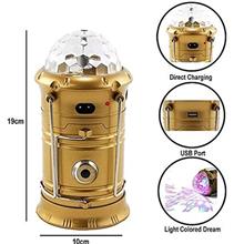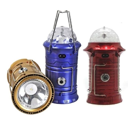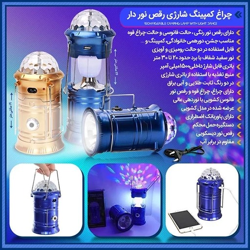 چراغ کمپینگ شارژی رقص نور دار دارای رقص نور رنگی ، حالت فانوسی و حالت چراغ قوه مناسب جشن، دورهمی خانوادگی، کمپینگ و قابل استفاده در دو حالت رومیزی و آویزی
