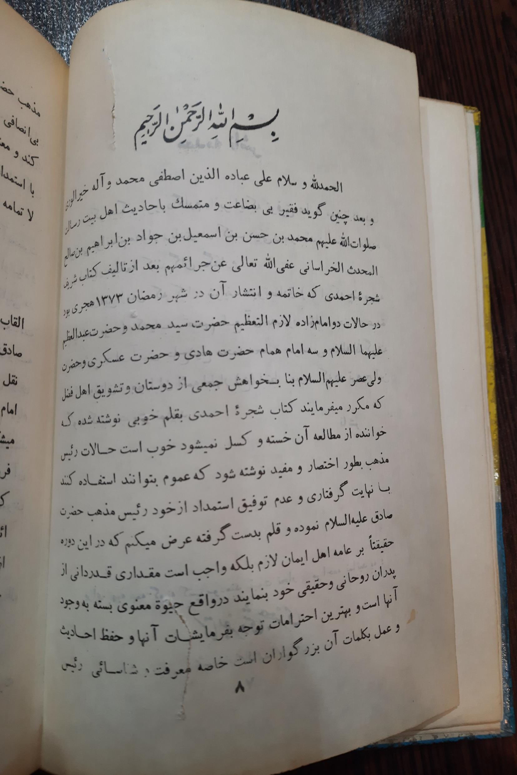 هشت صفحه اول کتاب، پارگی اندکی دارد که در عکس مشهود است. بفیه صفحات کتاب سالم است.