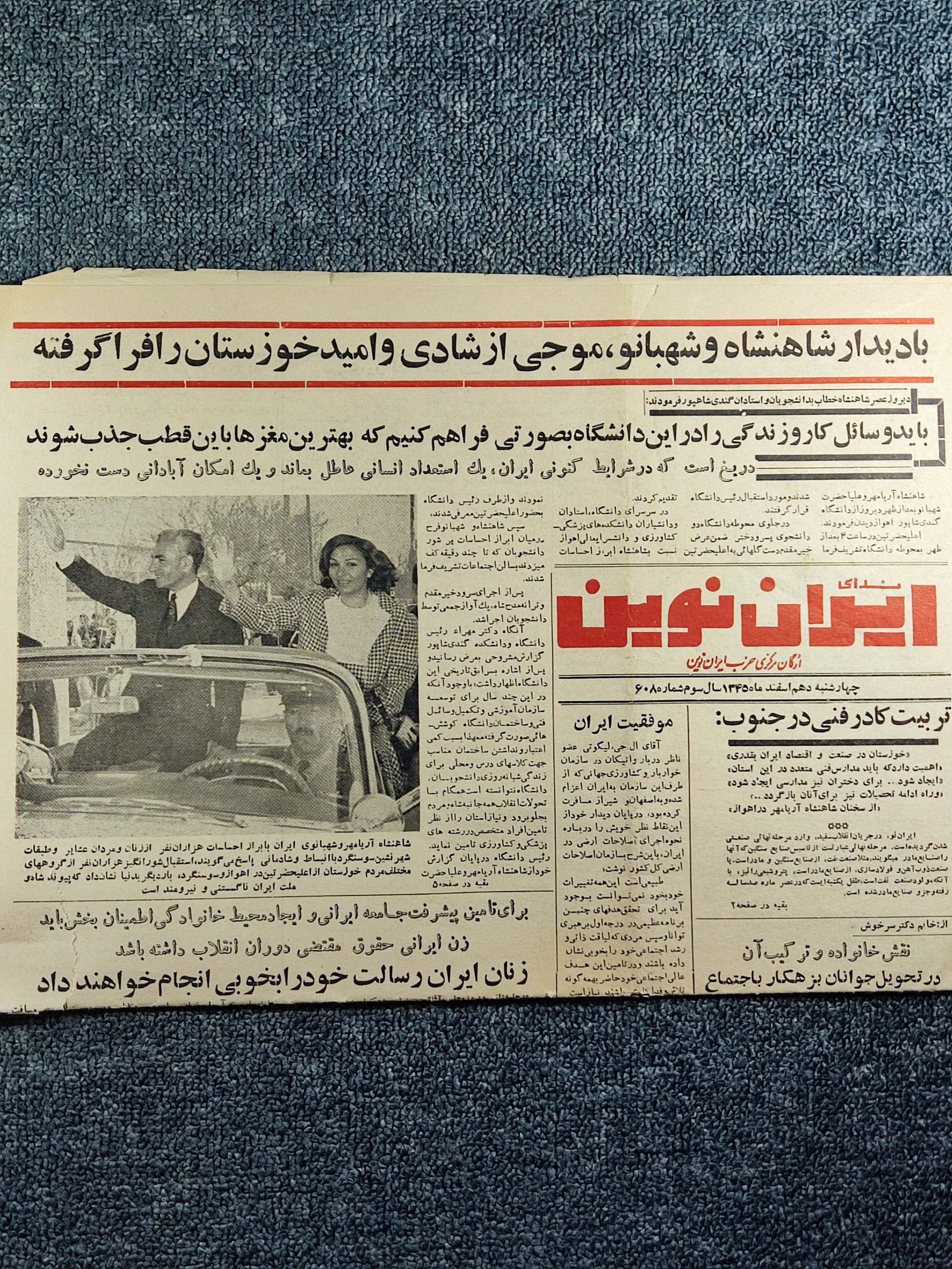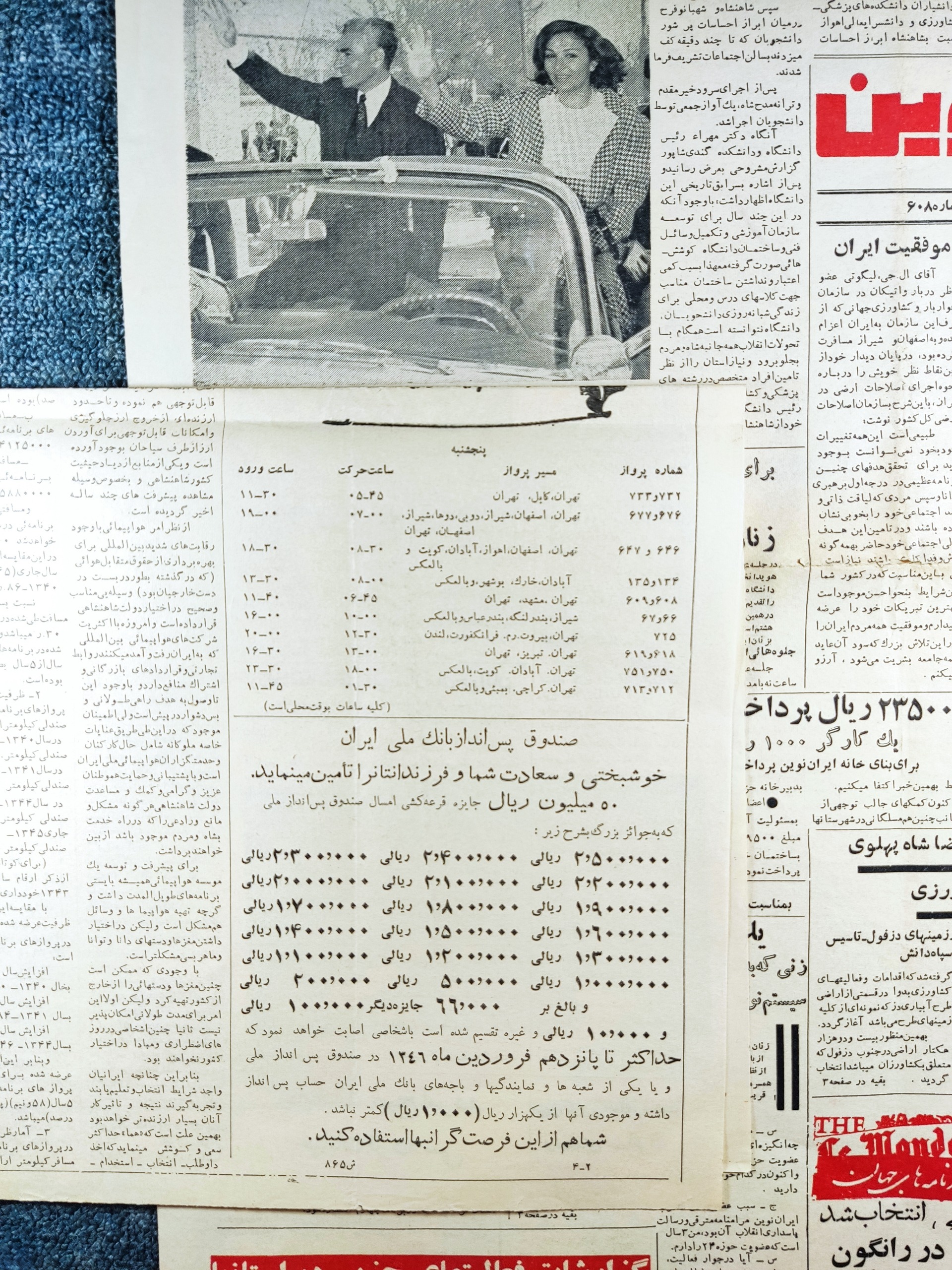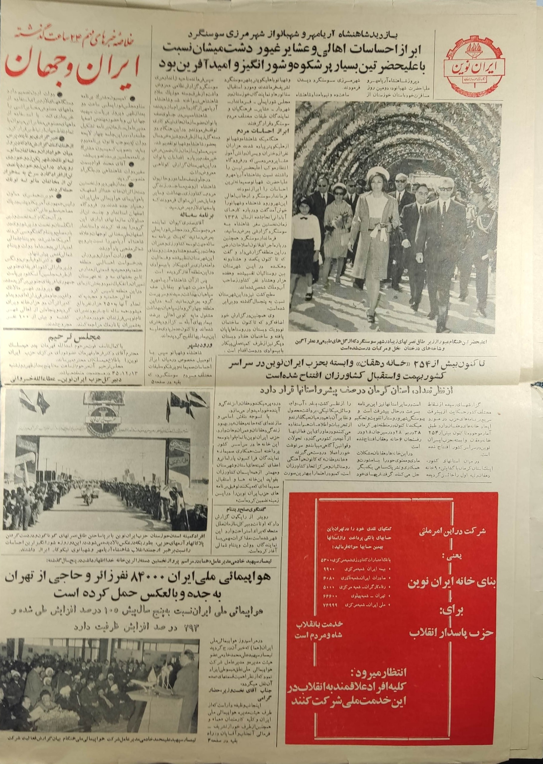 روزنامه ندای ایران نوین چاپ 1345 کمیاب ...بازدید محمد رضا پهلوی و فرح پهلوی از خوزستان و شهر سوسنگرد.... افتتاح خانه دهقان با حضور محمدرضا پهلوی و فرح پهلوی لیست ساعت پرواز هواپیمای و تبلیغ زیبای بانک ملی و جوایز سال 1346 خلاصه این که یه روزنامه خاص و کلکسیونی