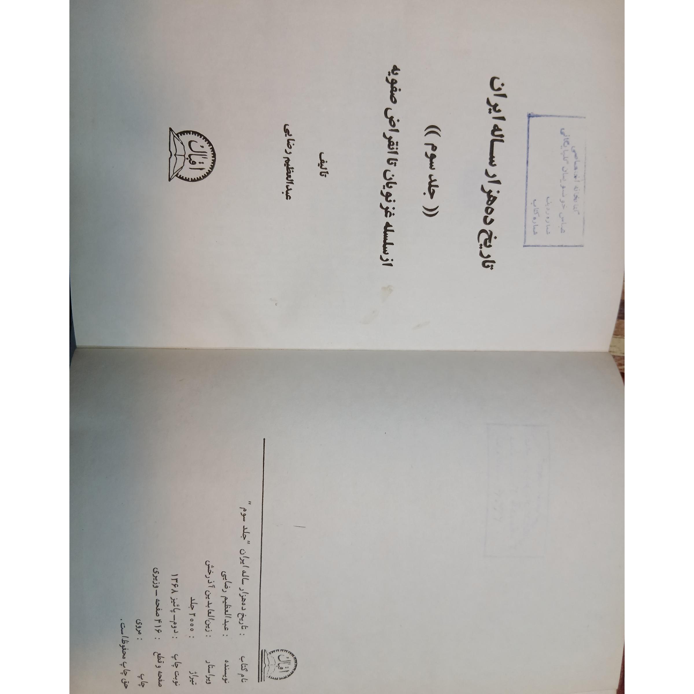 جلد سوم تاریخ ده هزار ساله ایران،صفحه اول مهر کتابخانه شخصی دارد