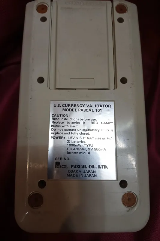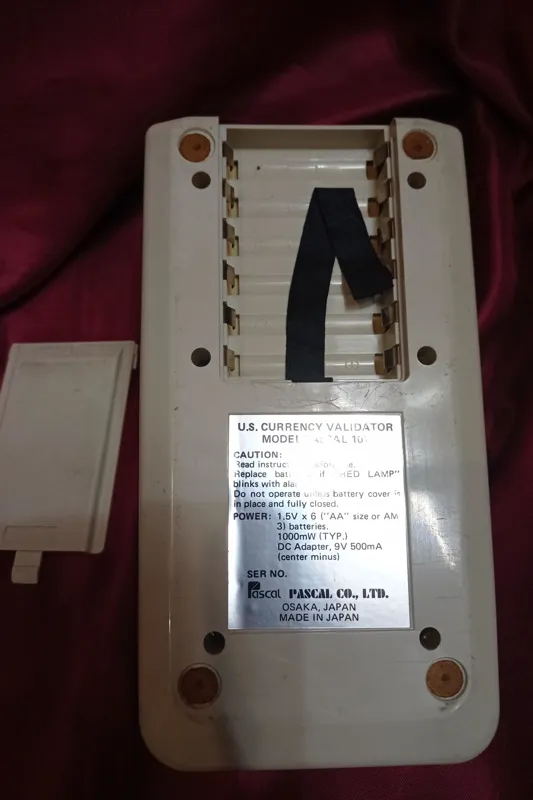 دستگاه فوق سالم و قابل استفاده است لیکن اسکناس های جدید را شناسایی نمی کند . مدل پاسکال ، ساخت ژاپن ، تعداد شش عدد باتری قلمی می خورد . آدابتور ندارد .