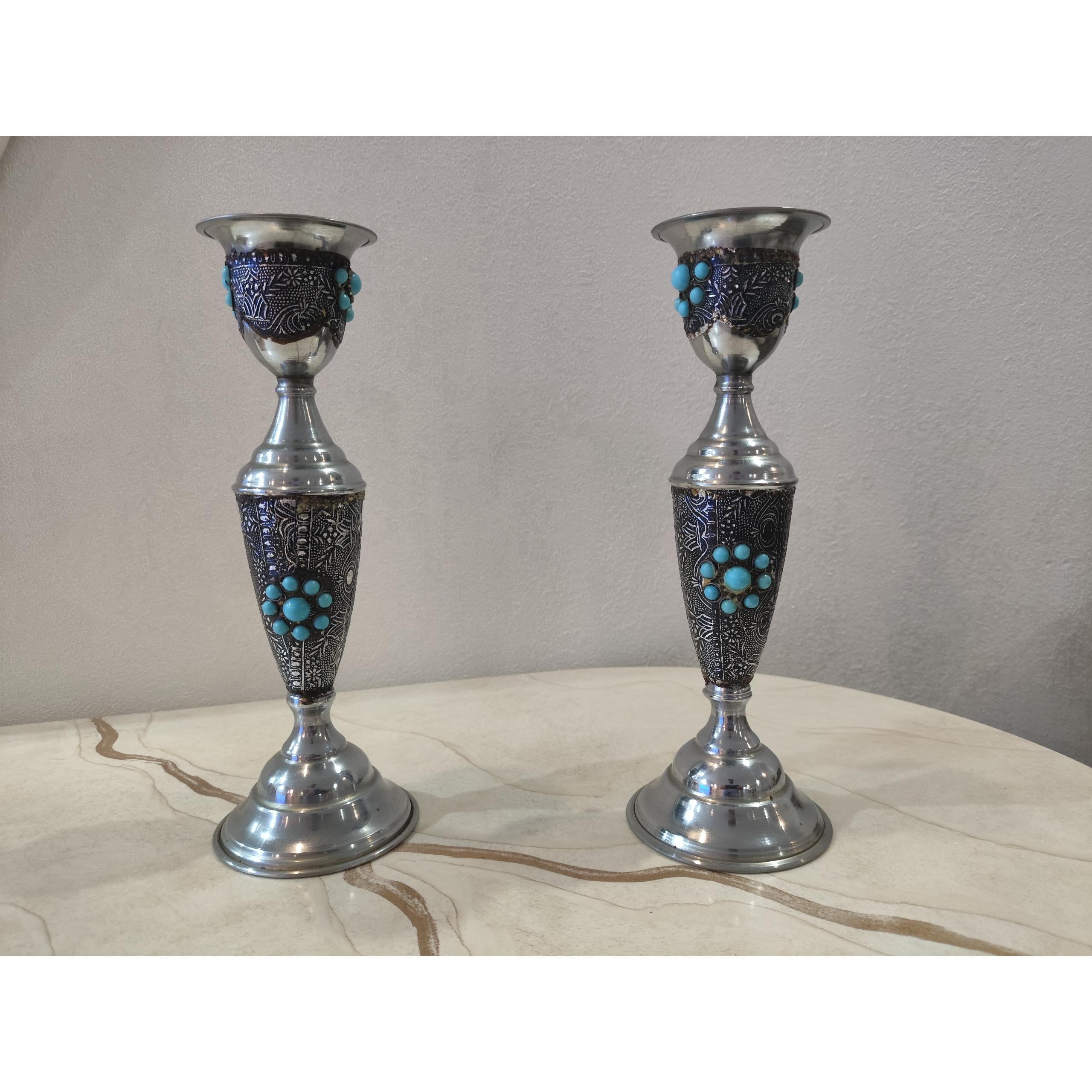 یک جفت شمعدان استیل با ورق پرس شده آلومینیومی به عنوان تزئین و سنگهای مصنوعی فیروزه بر روی کار به ارتفاع 15 سانت.فروش بصورت جفت