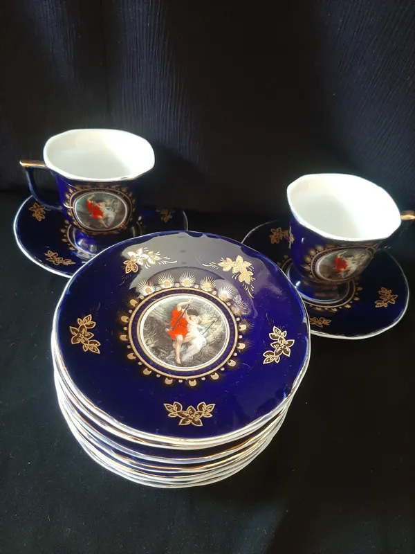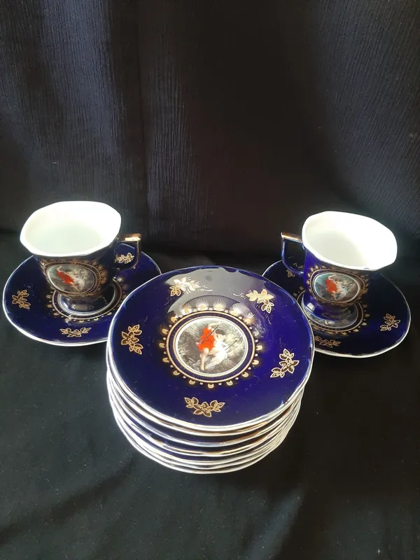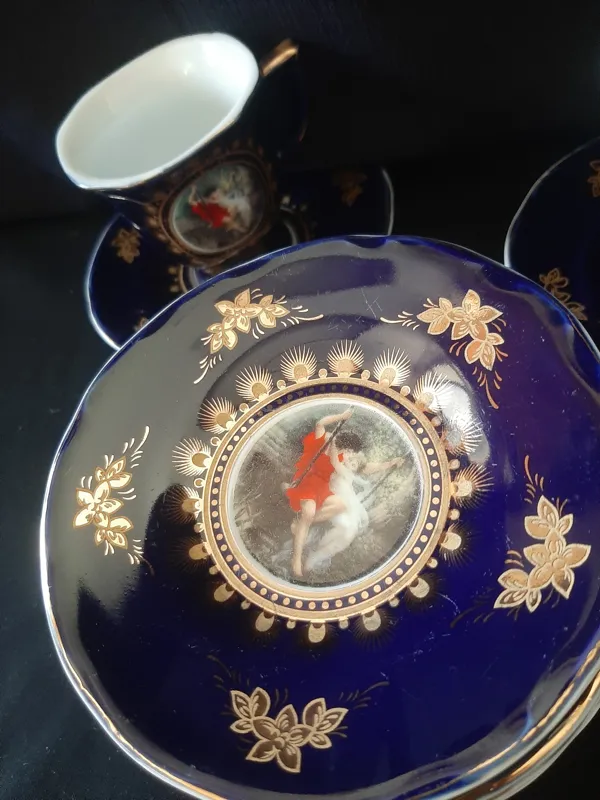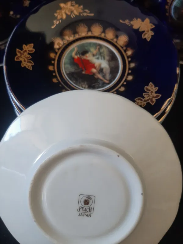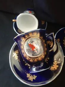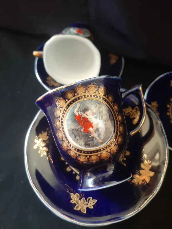 دو عدد فنجان قطر 6 و نیم ارتفاع 7 و 9 تا نعلبکی قطر 10 و نیم نقاشی با آب طلا ساخت ژاپن سرمه ایی عکس وسط بی نظیر دست دوم لبپری ندارند