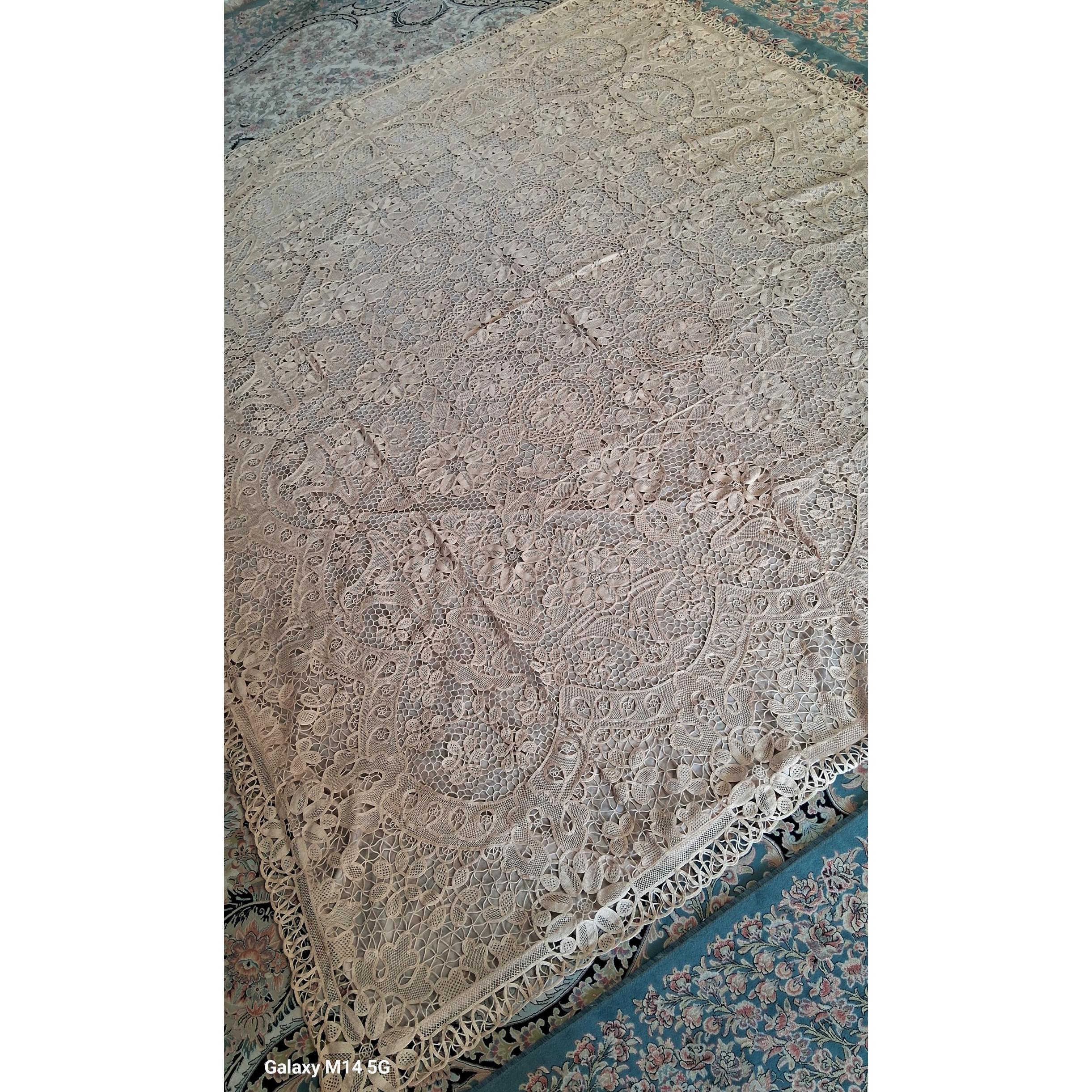 روتختی 2نفره گیپوربافی قدیمی، مال 30 سال پیشه، 2 الی 3 هفته استفاده شده، ولی کاملا نو و سالمه، آستردوزی شده، 3 تا رو میزی شبیه خودش هم هست که تقدیم میشه. مارک اون هنوز بش وصله. رو بالشی نداره.