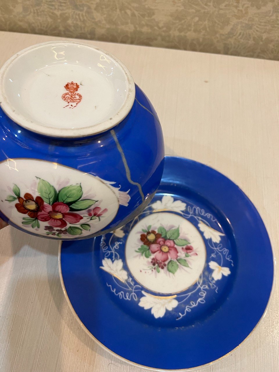 لکههایی در قسمتهایی از کاسه و رنگ رفتگی در قسمتهای کوچکی از بشقاب وجود دارد . لطفا به توضیحات و عکسها توجه کامل شود .