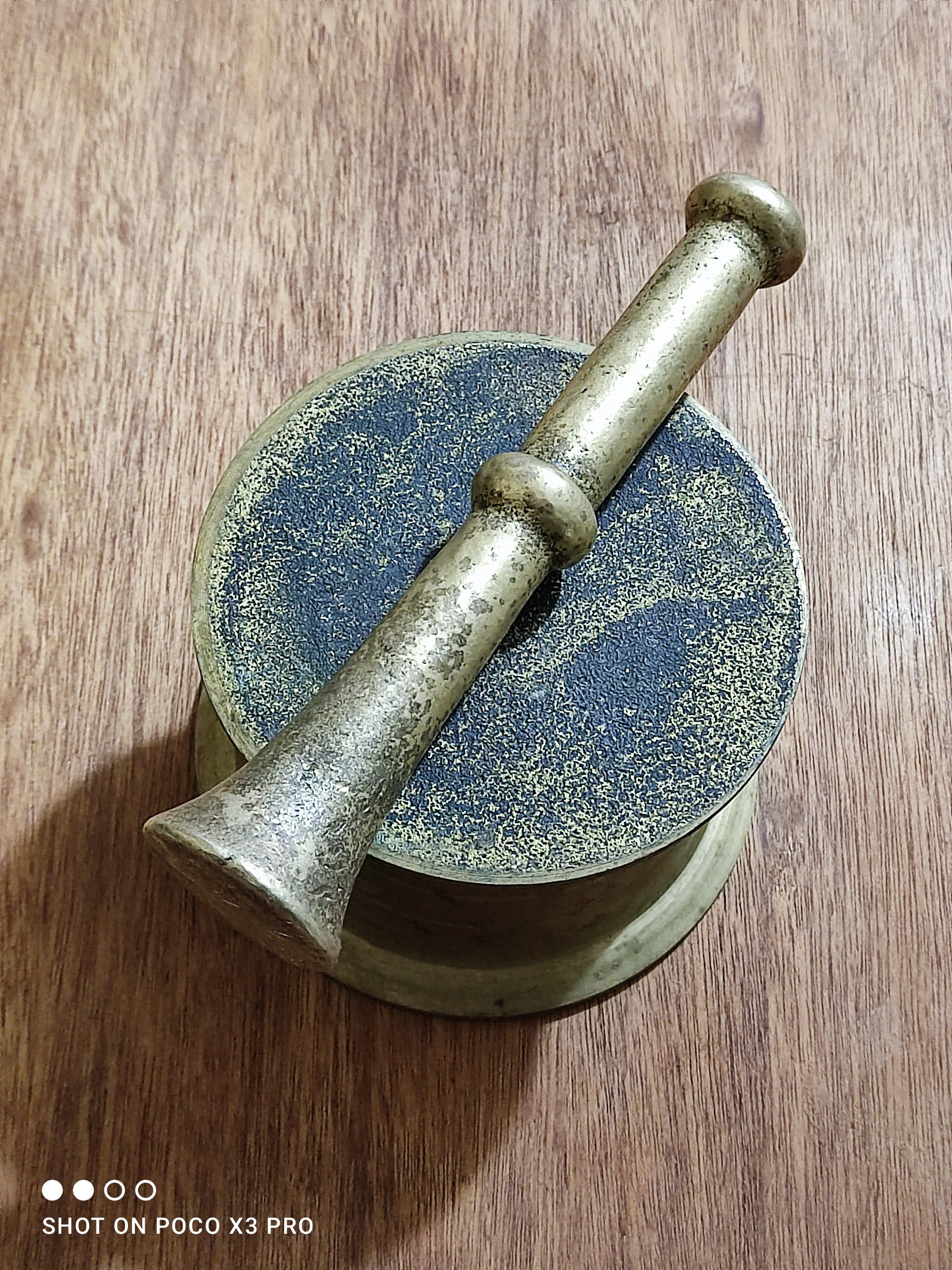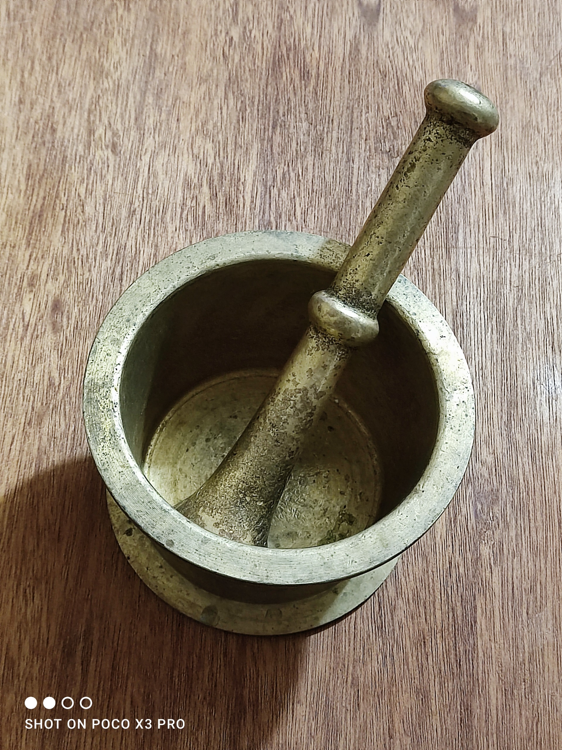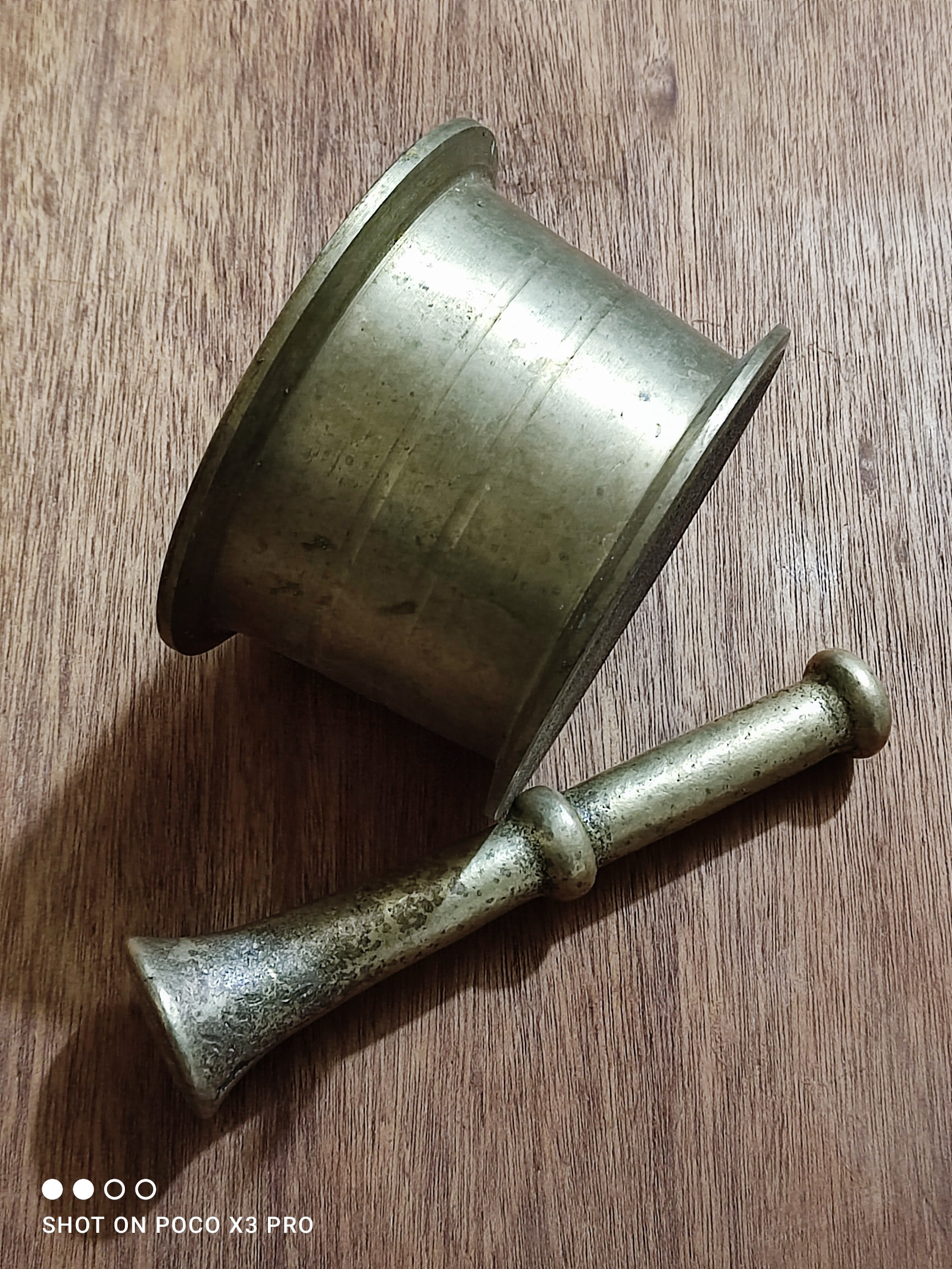 یک عدد هاون برنجی قدیمی به وزن تقریبی دو کیلوکرم سایز متوسط رو به بالا مطابق تصاویر سالم و تمیز و بکر و بسیار محکم و جوندااار