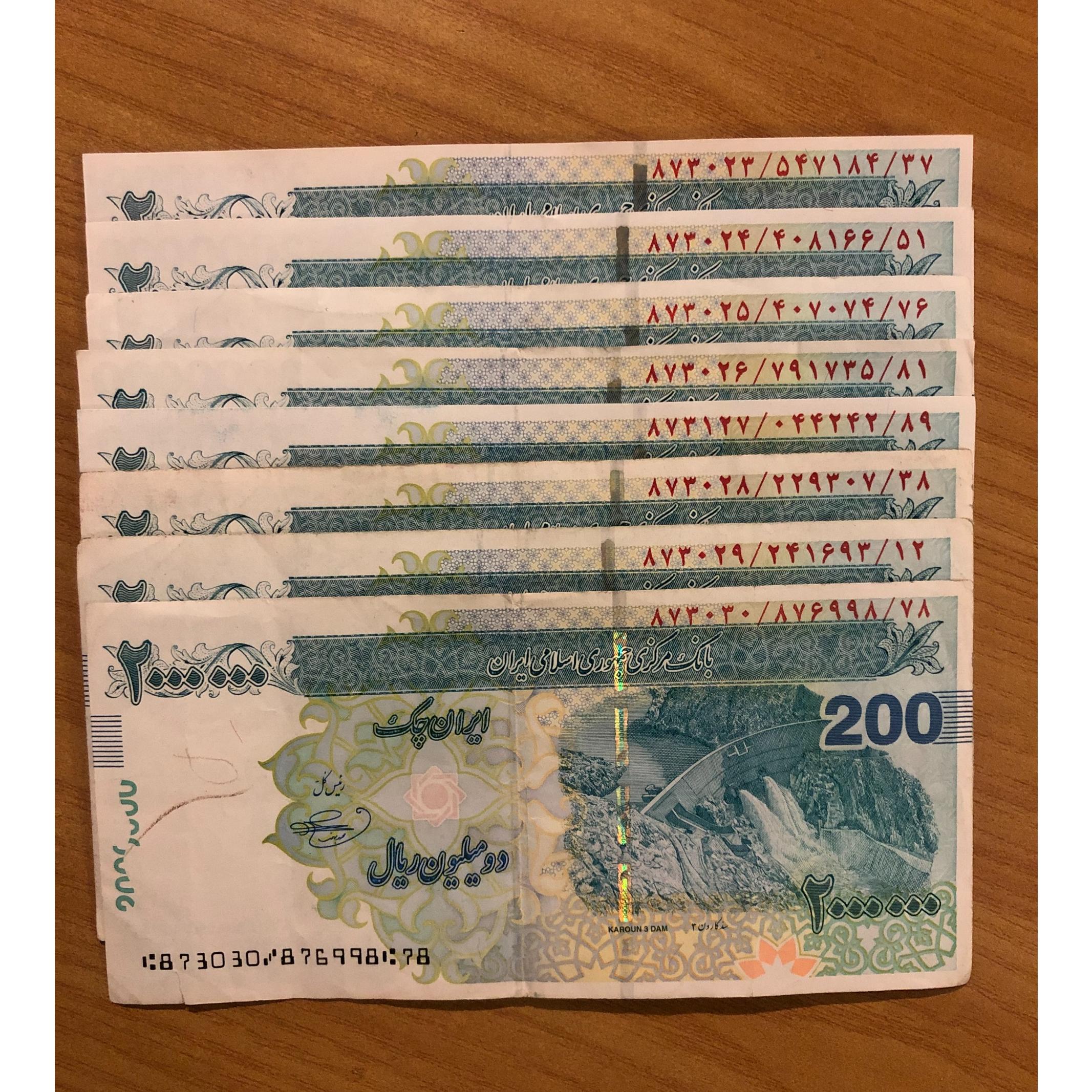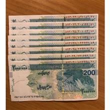 8عدد اسکناس 200هزارتومانی جمهوری اسلامی درحدنو که سریال کسر ان پشت همی و استثنایی میباشد...توضیح اینکه 16 عدد دیگر ازهمین کسربرای فروش گذاشته که فقط یکعدد فرق دارد...