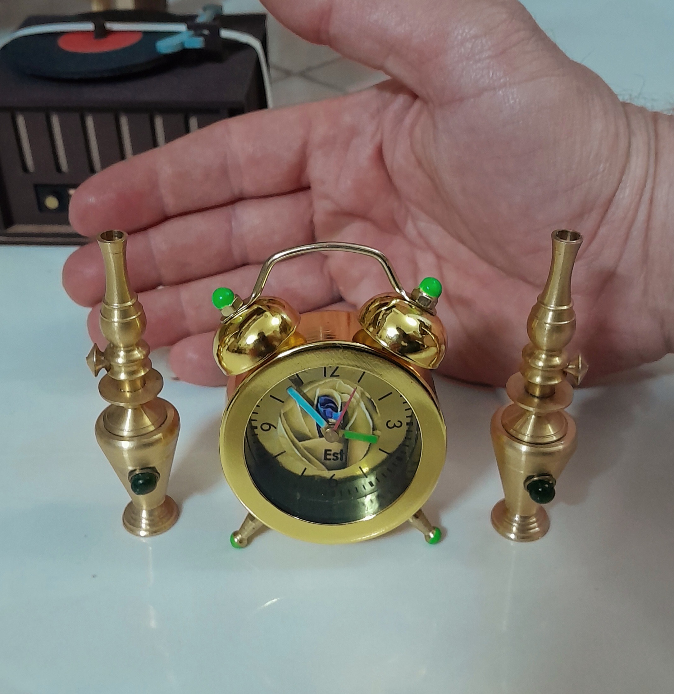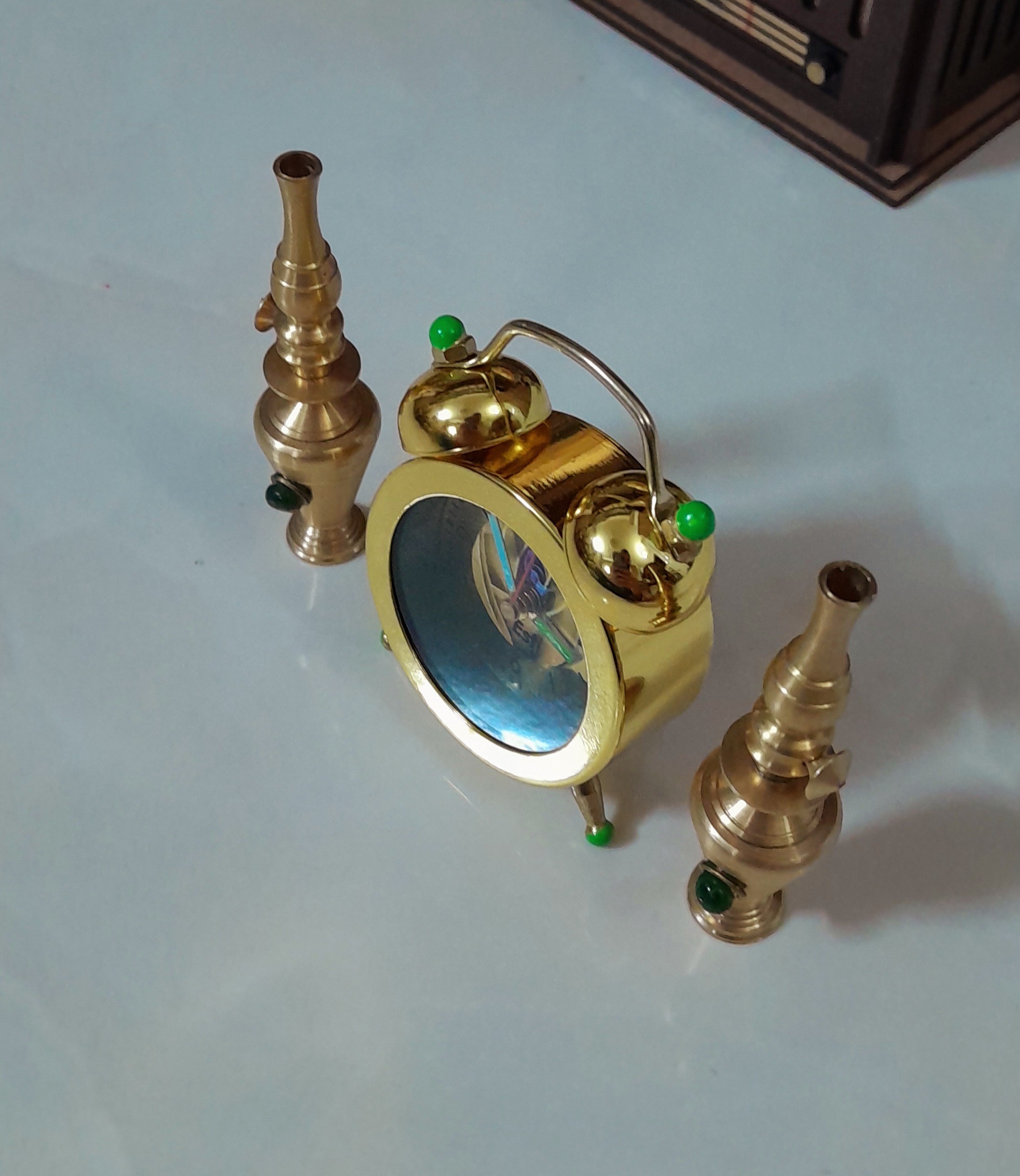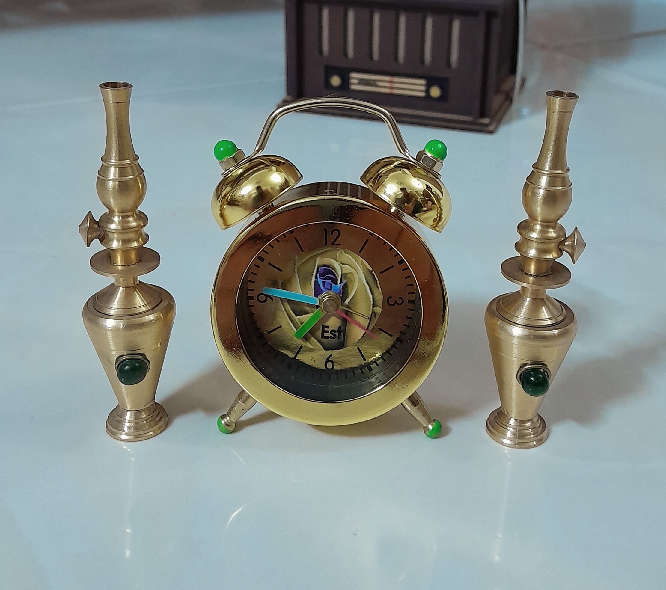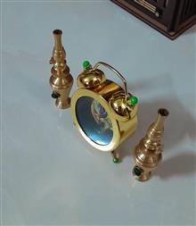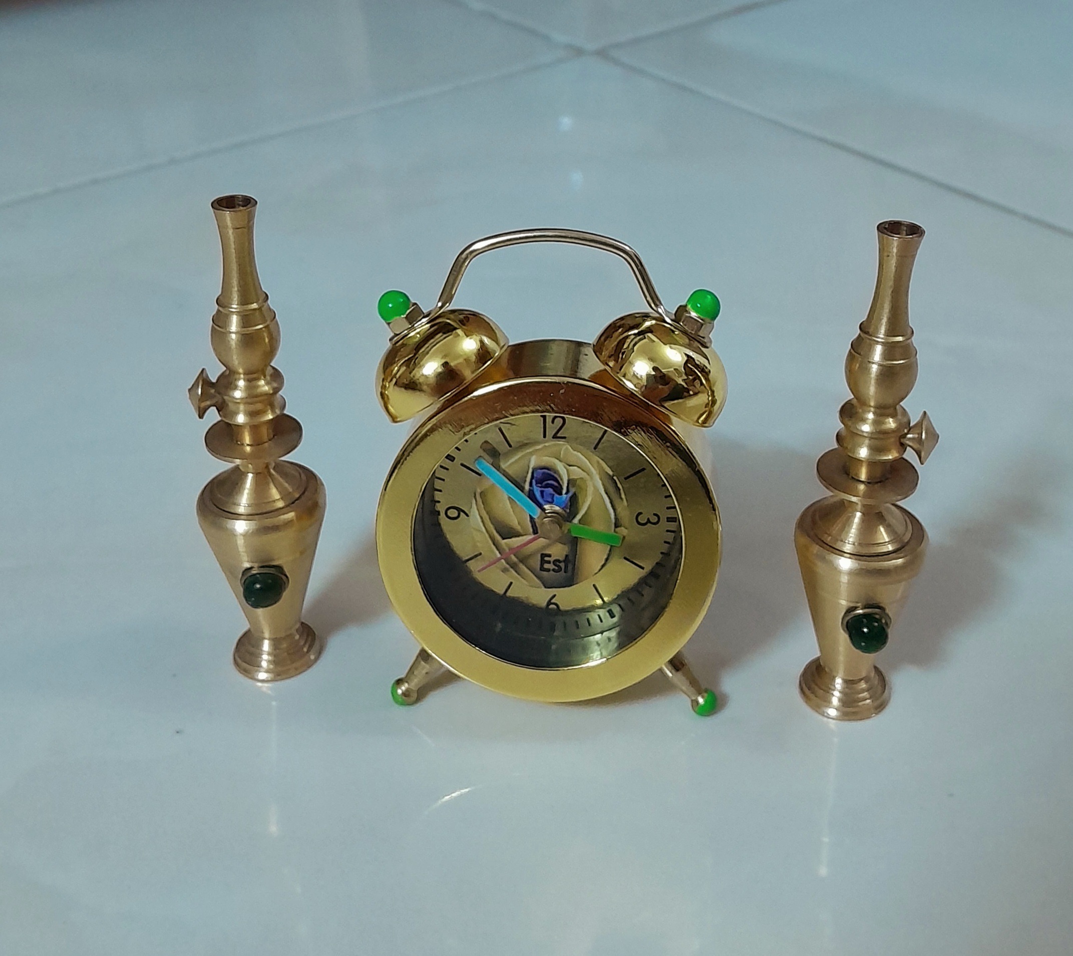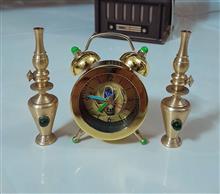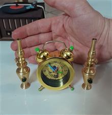 ساعت رومیزی زیبا زنگدار همراه با 2عدد گردسوز برنجی کوچک.