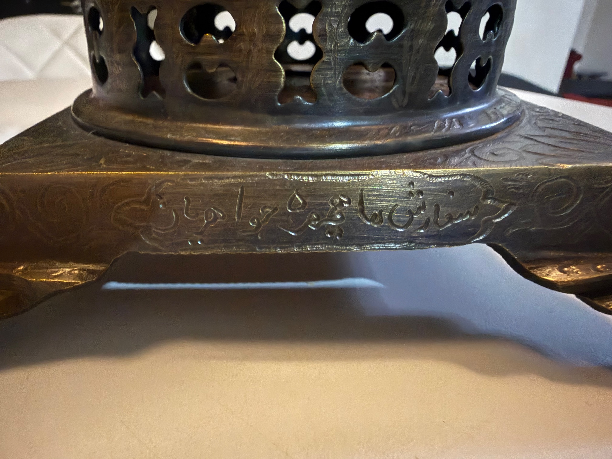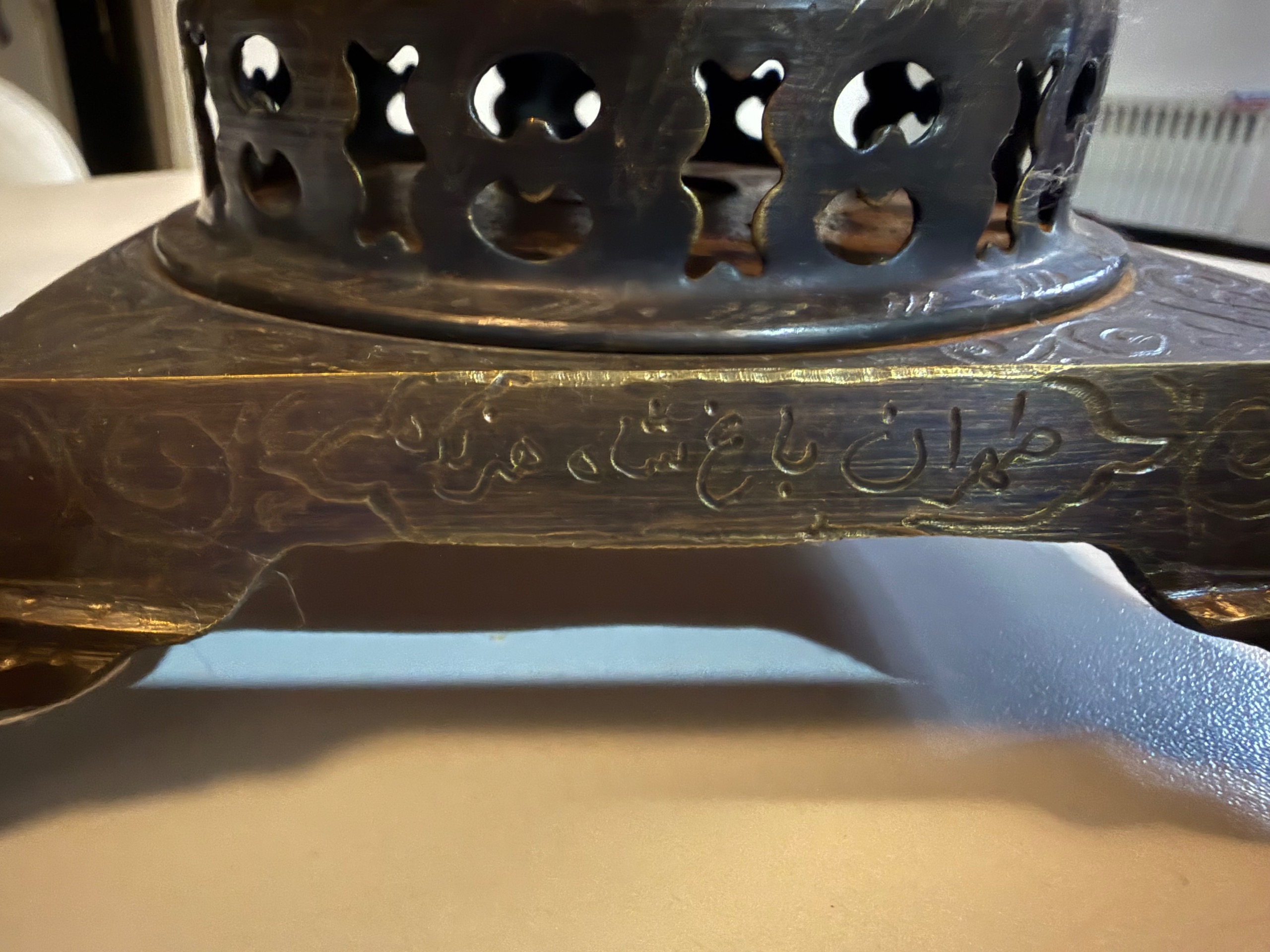 سماورذغالی کاردست استادموستوجی از طهران به سفارش بانوماه چهره جواهریان درسنه 1338 حدود چهارلیترشایدکمی کمتر یا بیشتر ارتفاع کار حدود45سانت بسیارزیبا سوالی بوددرخدمتم هیچ گونه فرورفتگی ندارد دسته های سماوروخودسماوربرنج یا برنز می باشد خفه کن و خروجی بخارهم داردوکاملا سالم و قابل استفاده روزمره البته باتوجه به آنتیک بودن اینجانب دکورگذاشتم