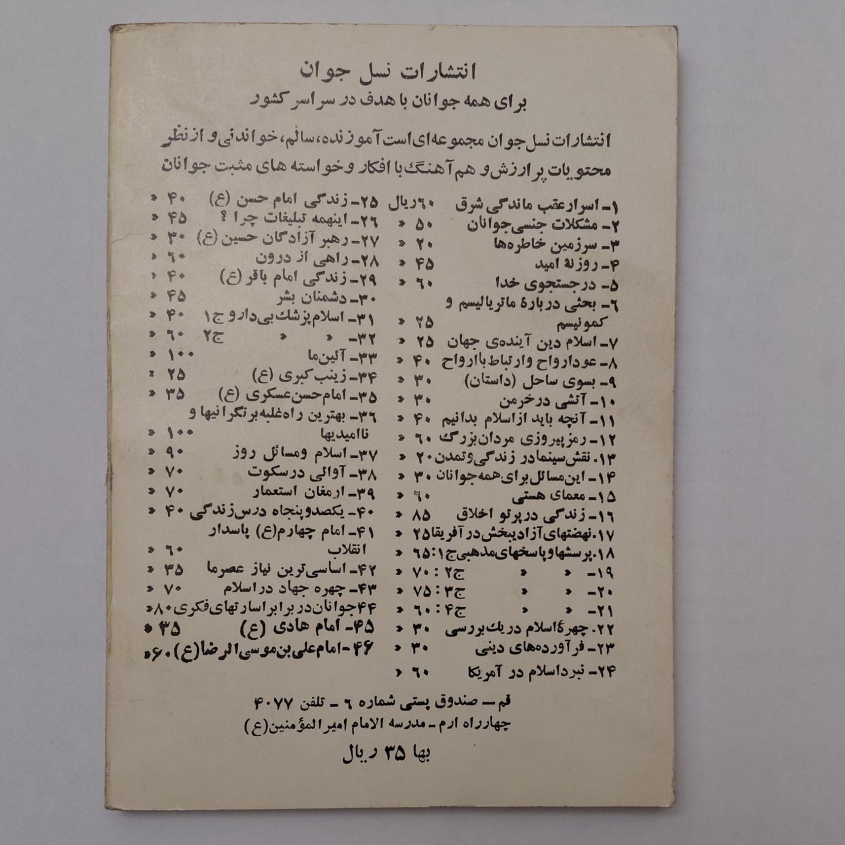 یک جلد کتاب جیبی از سری کتابهای پیشوایان اسلام با عنوان زندگانی امام هادی (ع)، چاپ 1357 در 112 صفحه از انتشارات نسل جوان، متن کتاب تمیز و بدون نوشته است، مطابق تصاویر