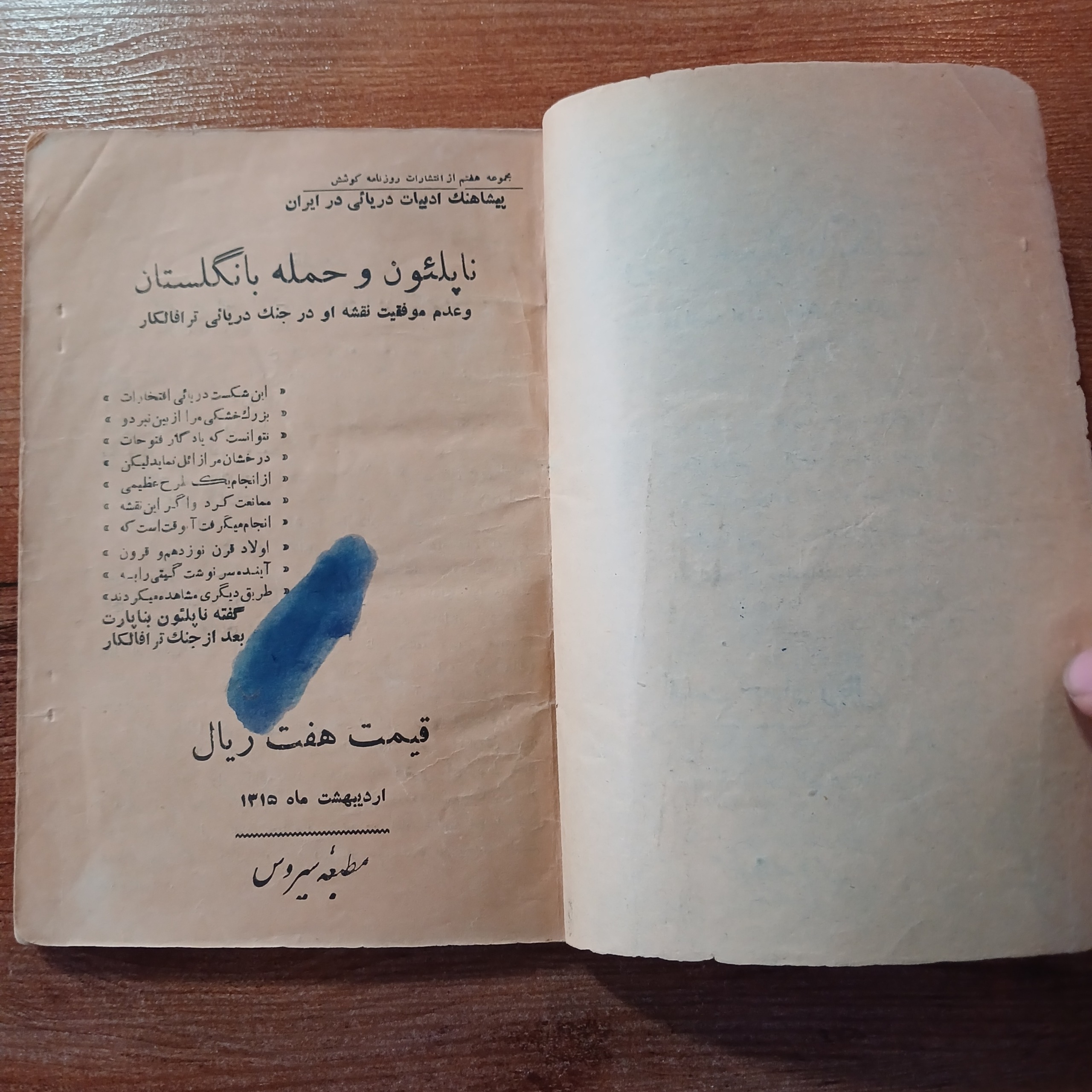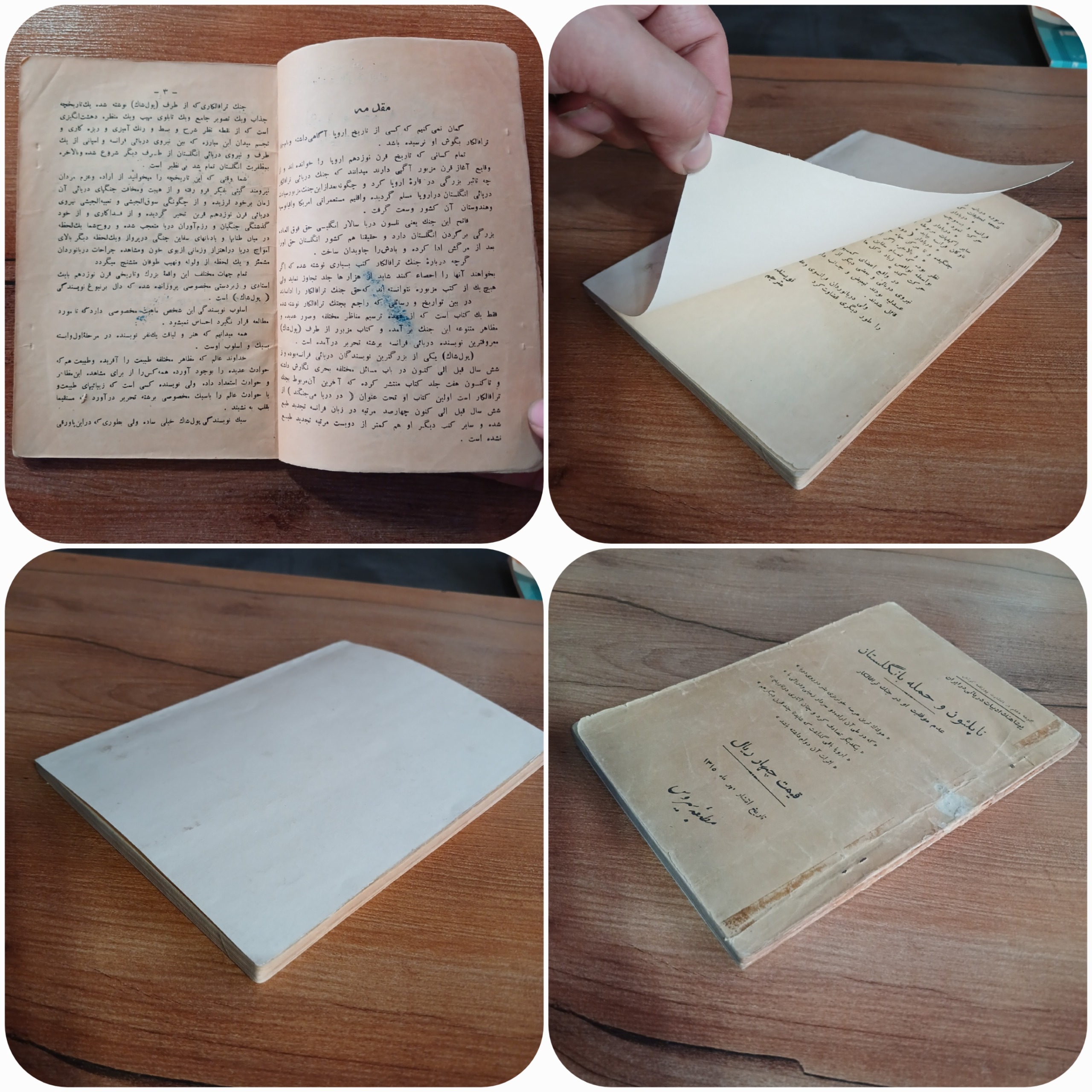 - کیفیت داخل کتاب بدون نوشته و مهر، فقط صفحه اول لک جوهر آبی رنگ دارد، در تصویر مشخص است