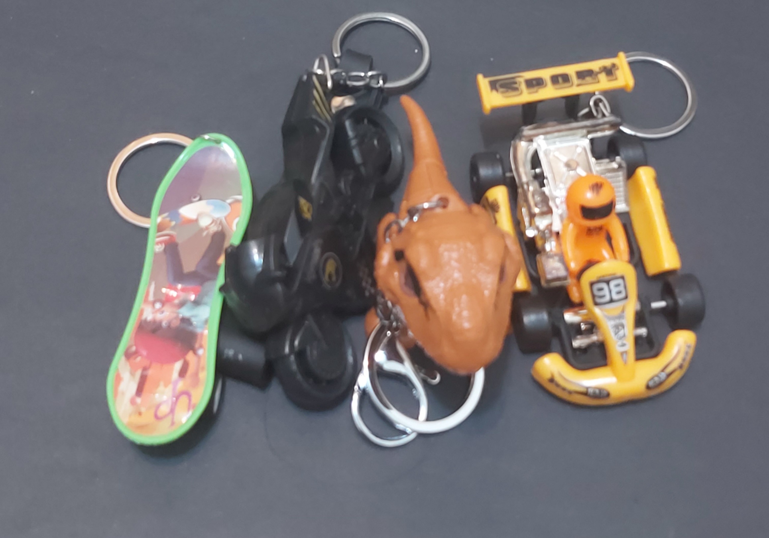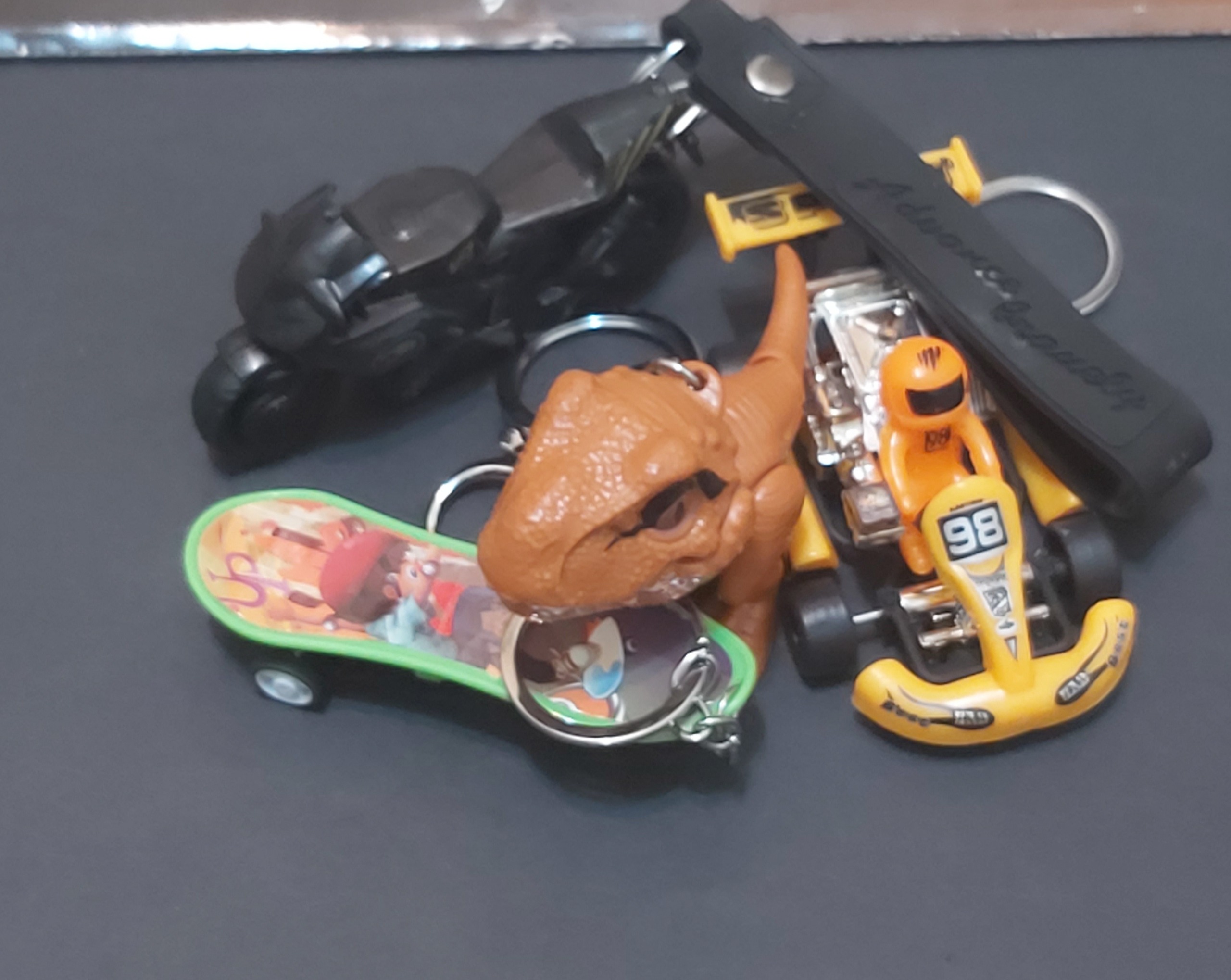 کیفیت طبق تصاویر..ماشین و اسکیت چرخ دارکمی هم مکانیکی حرکت کم..دایناسور فک و پا و دم متحرک ثابت..موتور ماکت..اما دسته شیکی داره..بقیه حلقه ای..دایناسور حلقه جا کمری..مبلغ برای سه عدد..و البته اسکیت هدیه میشه خدمتتون ..