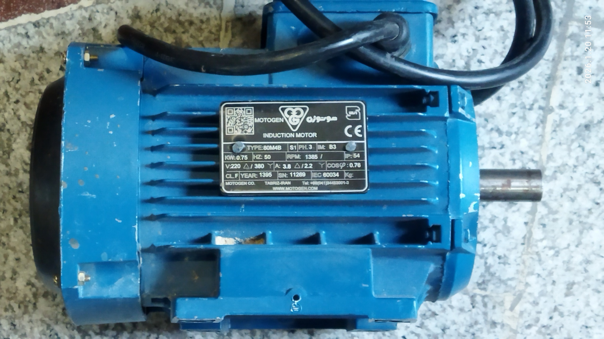 الکتروموتور سه فاز موتوژن یک اسب 75صدم کیلووات تمیز کم کار توی عکس تمام مشخصات معلوم هست بدنه آلمینیومی