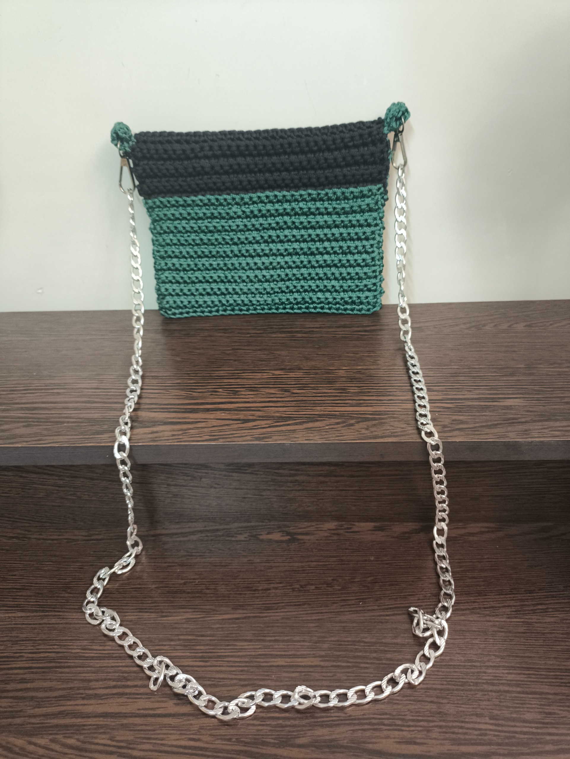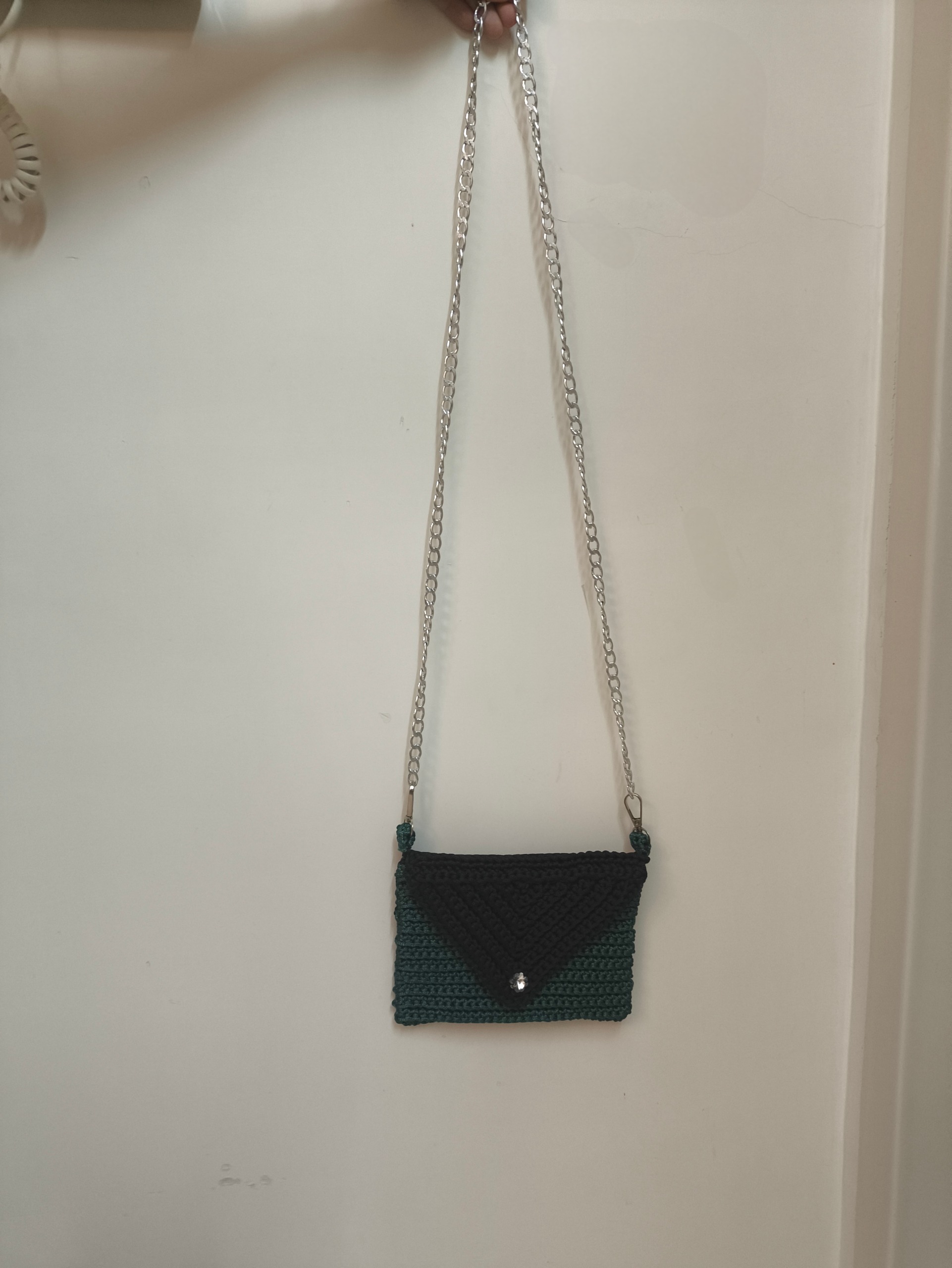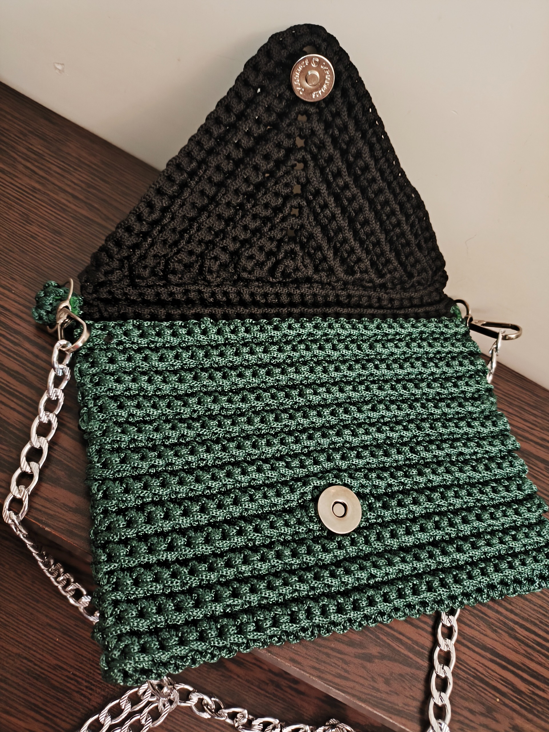 این کیف دستی زنانه به صورت بافت دستی و با ترکیب رنگ سبز و مشکی تهیه شده است. بند زنجیری محکم و طراحی خاص این کیف را به گزینهای مناسب برای استفاده روزمره یا مجالس تبدیل کرده است. دارای قفل زیبا و مناسب برای هدیه دادن. مناسب برای خانمهای شیکپوش که به صنایع دستی و اکسسوریهای خاص علاقه دارند.